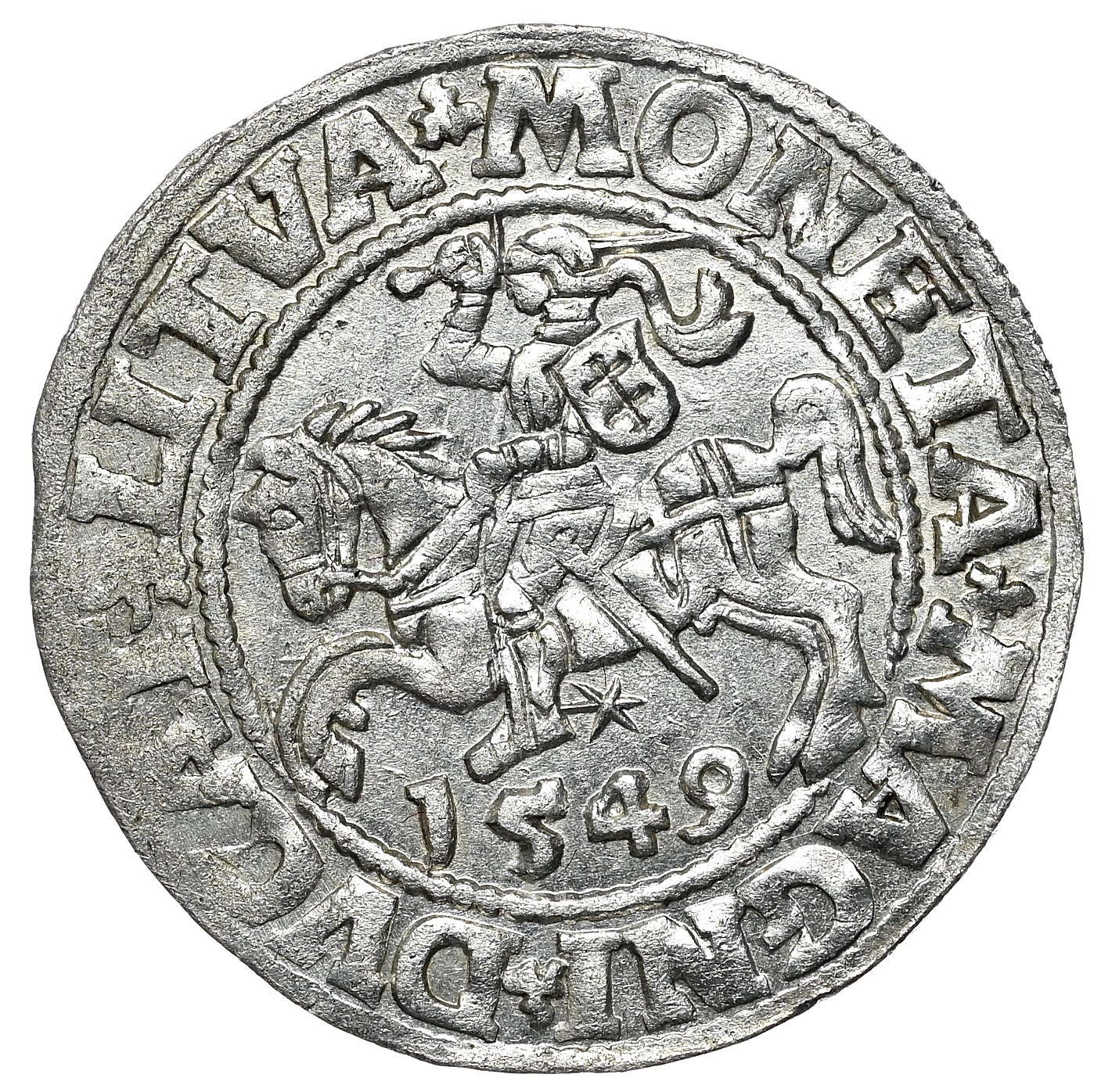 Końcówki napisów LITVA/LI. Jeździec z wygiętą tarczą. Ładny, połyskowy egzemplarz.
