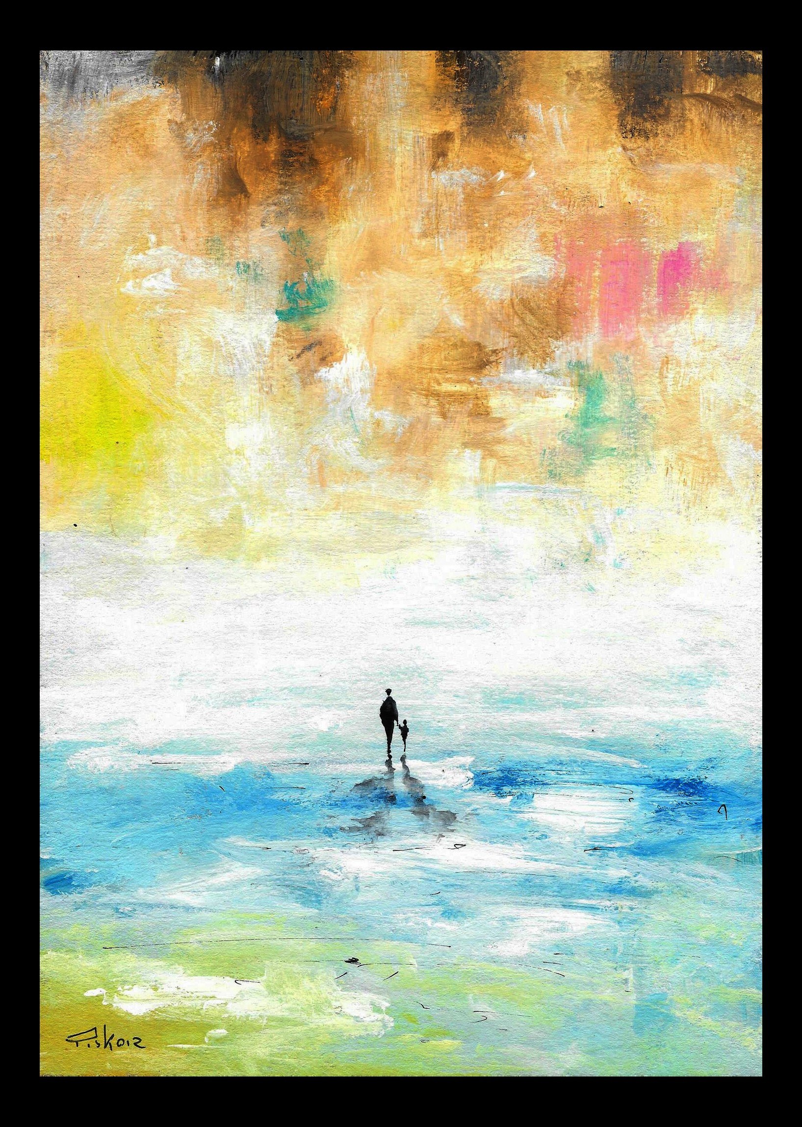 obraz malowany farbami akrylowymi i tuszem na tekturze introligatorskiej, rozmiar 21 x 29 cm, sygnowany