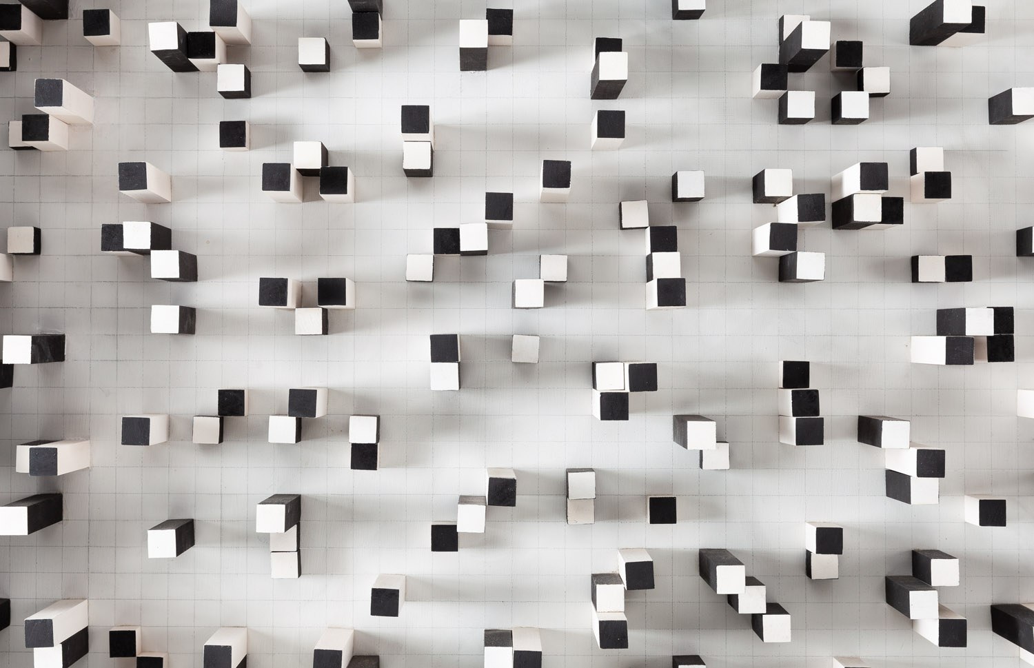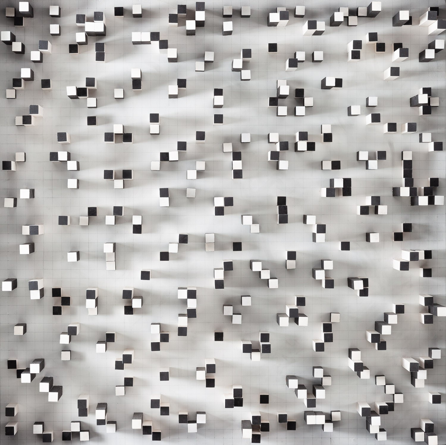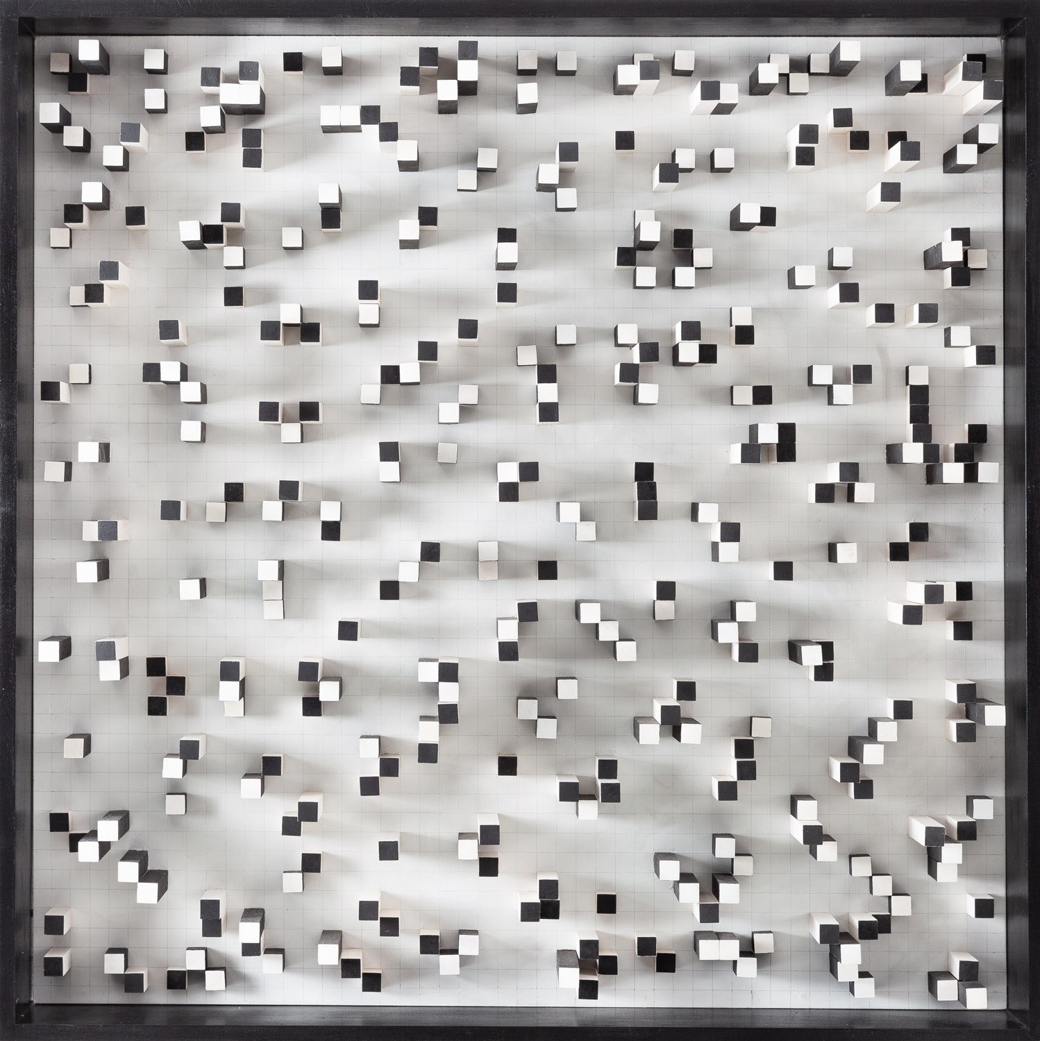 na odwrociu nalepka z opisem pracy i opisem gry: 'WINIARSKI 74 | OBSZAR 180 | Penetracja przestrzeni realnej ze zroznicowanym efektem | elementow zaleznym od ruchu widza | Zmienna losowa-kostka do gry'