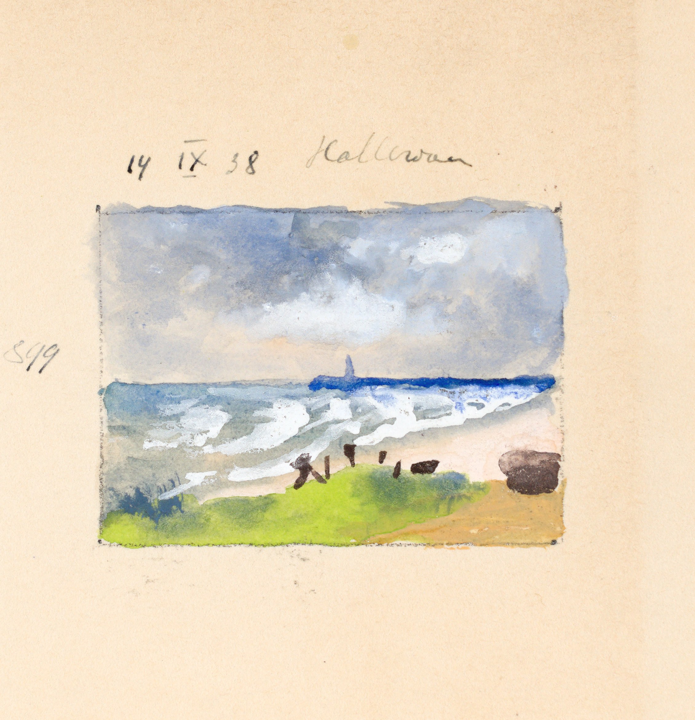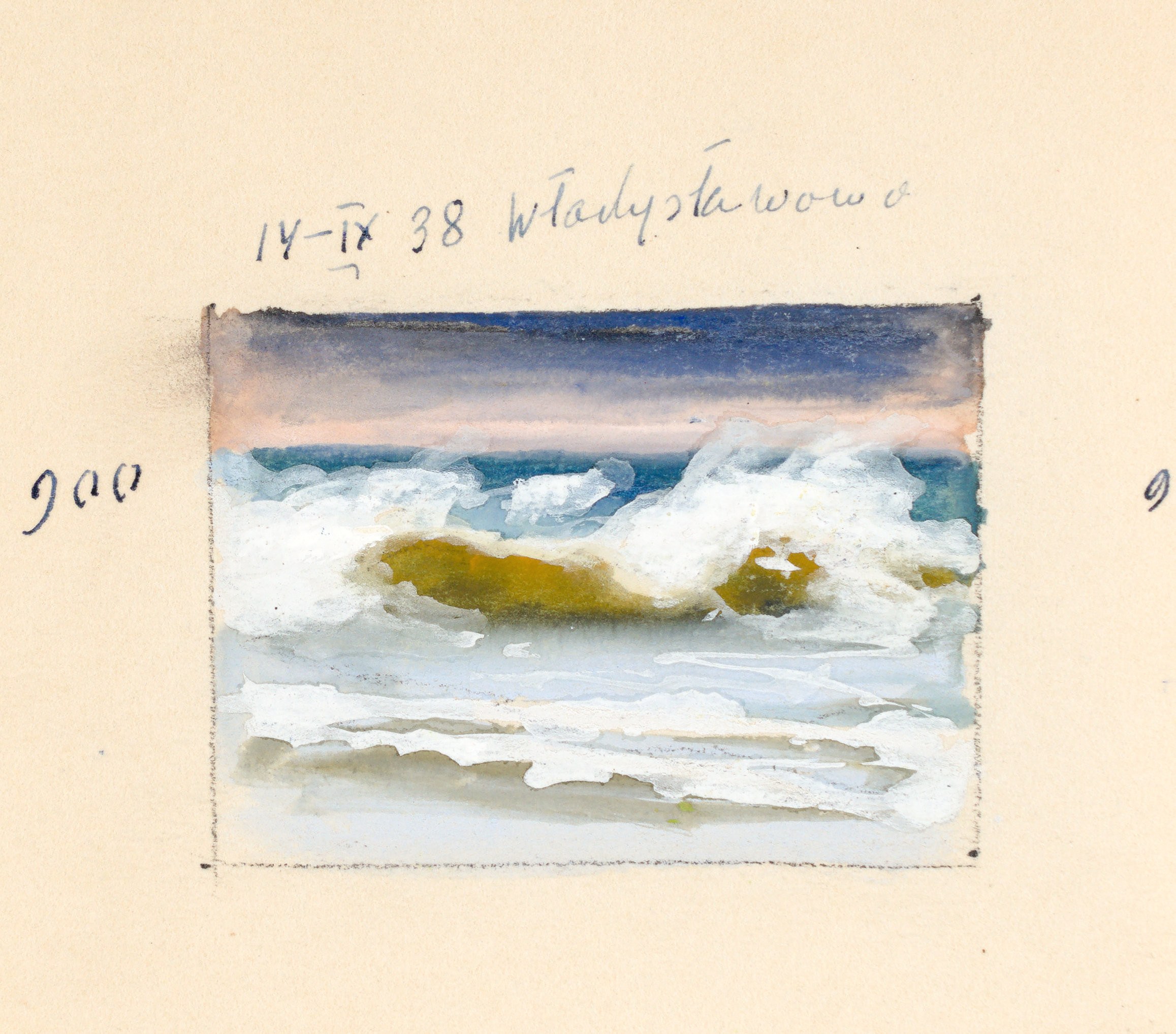 Na odwrocie rysunek: Brzeg morski, 1938 (5 x 6,8 cm) również opisany autorsko.