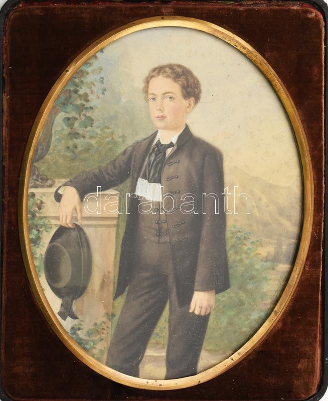 cca 1819 várkonyi gróf báró Üchtritz (Amade) Emil (1808-1886) a Branyiszkói csata hősének, Görgey ezredesének fiatalkori portréja 11 éves korában. Akvarell, papír. Jelzés nélkül. XIX. sz.bőr utazó keretben 21x17 cm, 20x23 cm Keret kissé sérült.