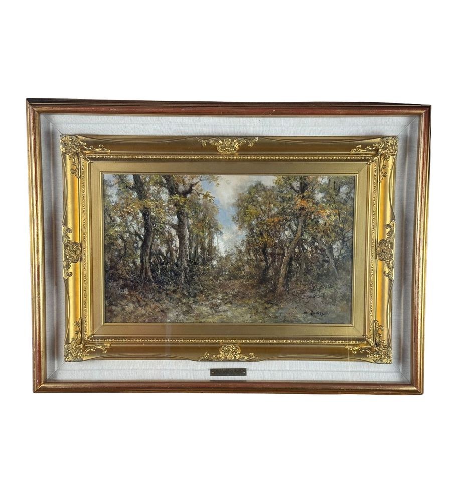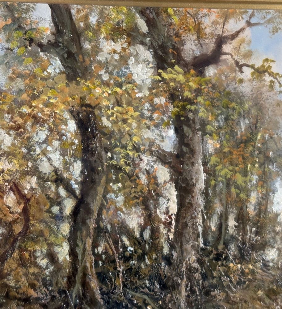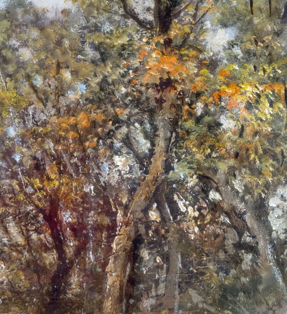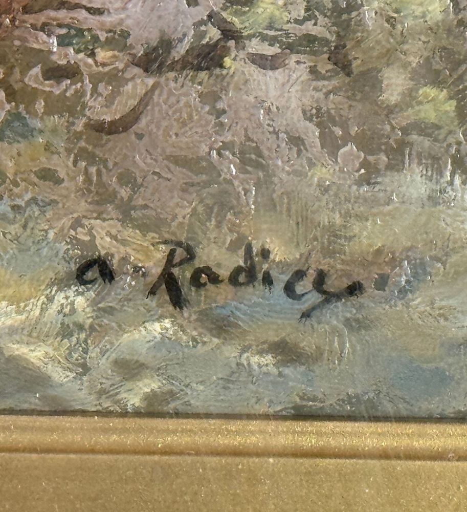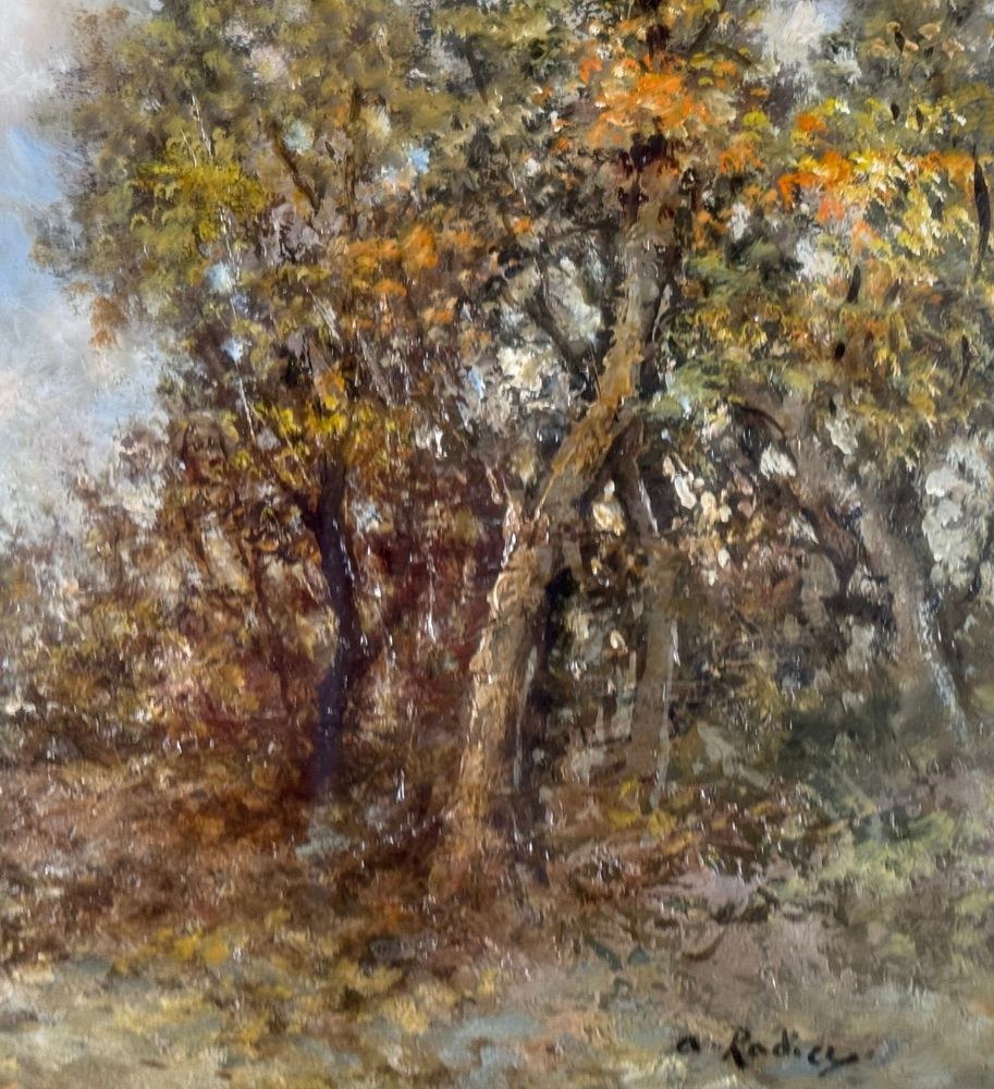 Oil painting on panel, 20th century Italian school, depicting a forest landscape. Dimensions including frame: 58x78 cm. Dimensions of the panel: 30x50 cm. Signed at the bottom right by Augusto Radice. The artwork is in good condition.