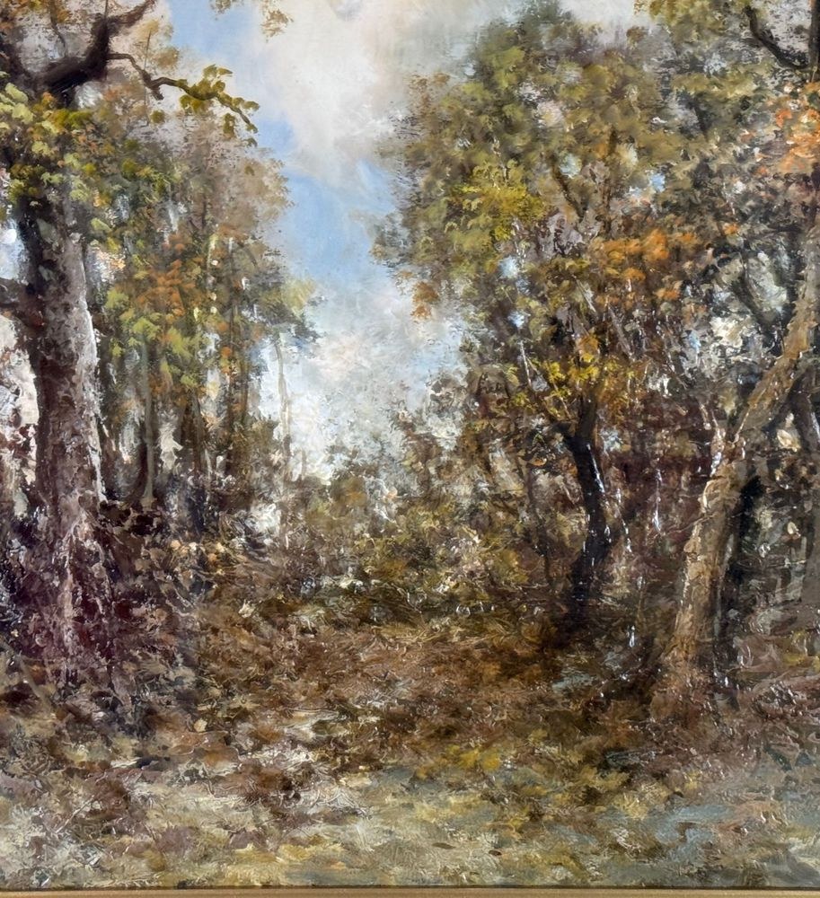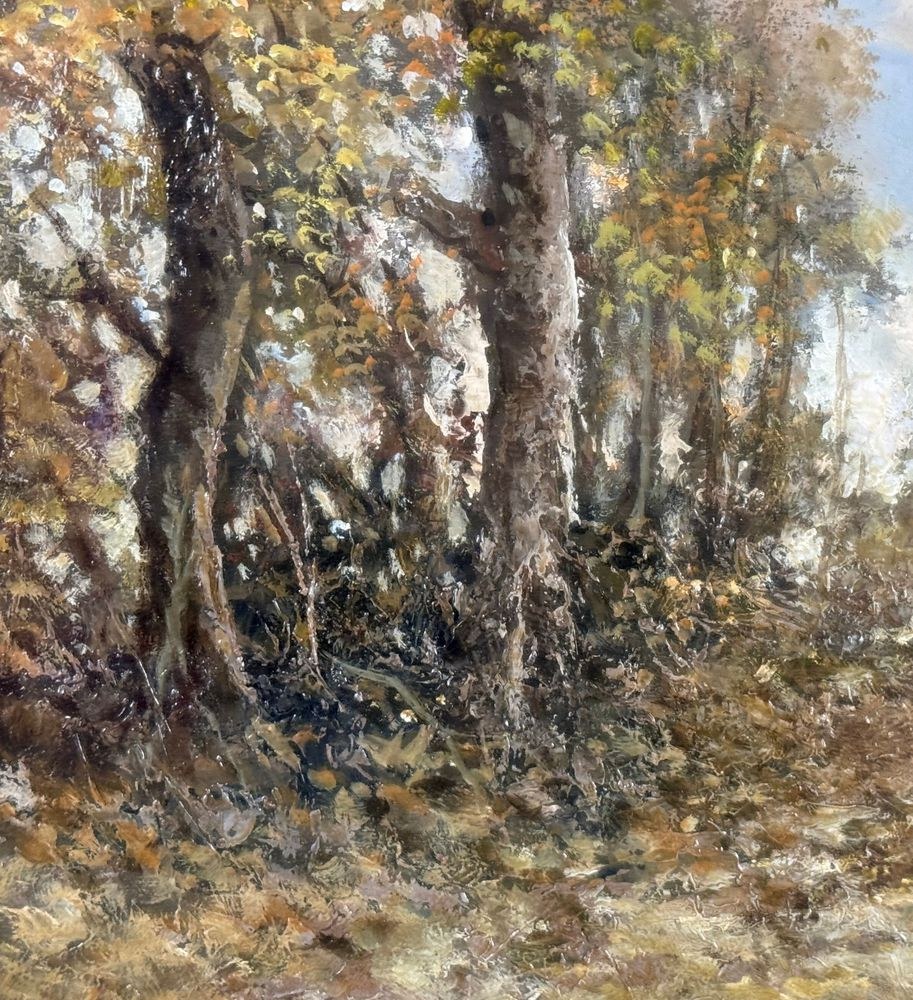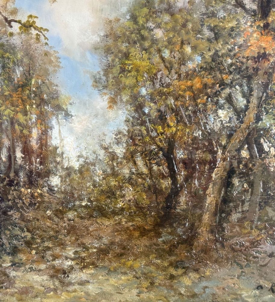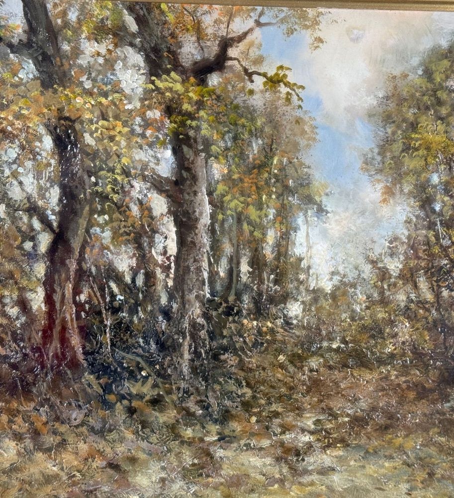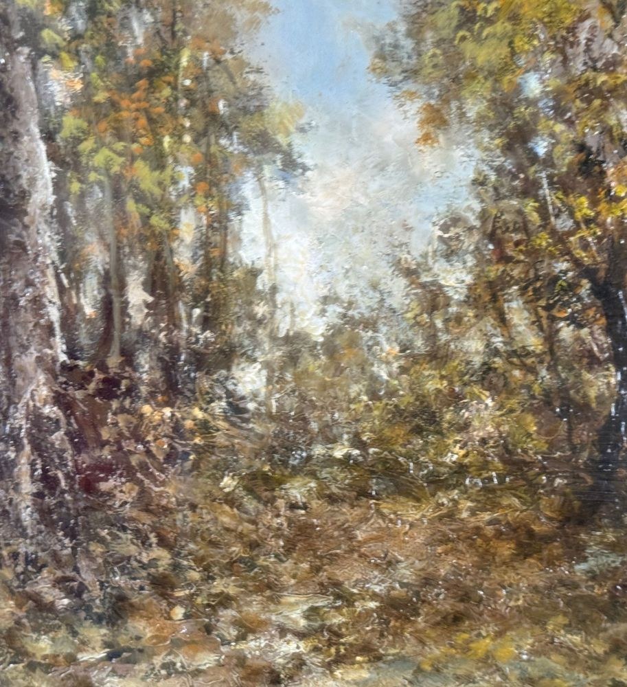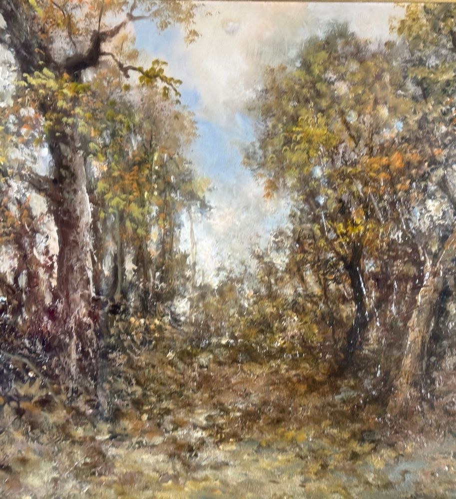 Oil painting on panel, 20th century Italian school, depicting a forest landscape. Dimensions including frame: 58x78 cm. Dimensions of the panel: 30x50 cm. Signed at the bottom right by Augusto Radice. The artwork is in good condition.