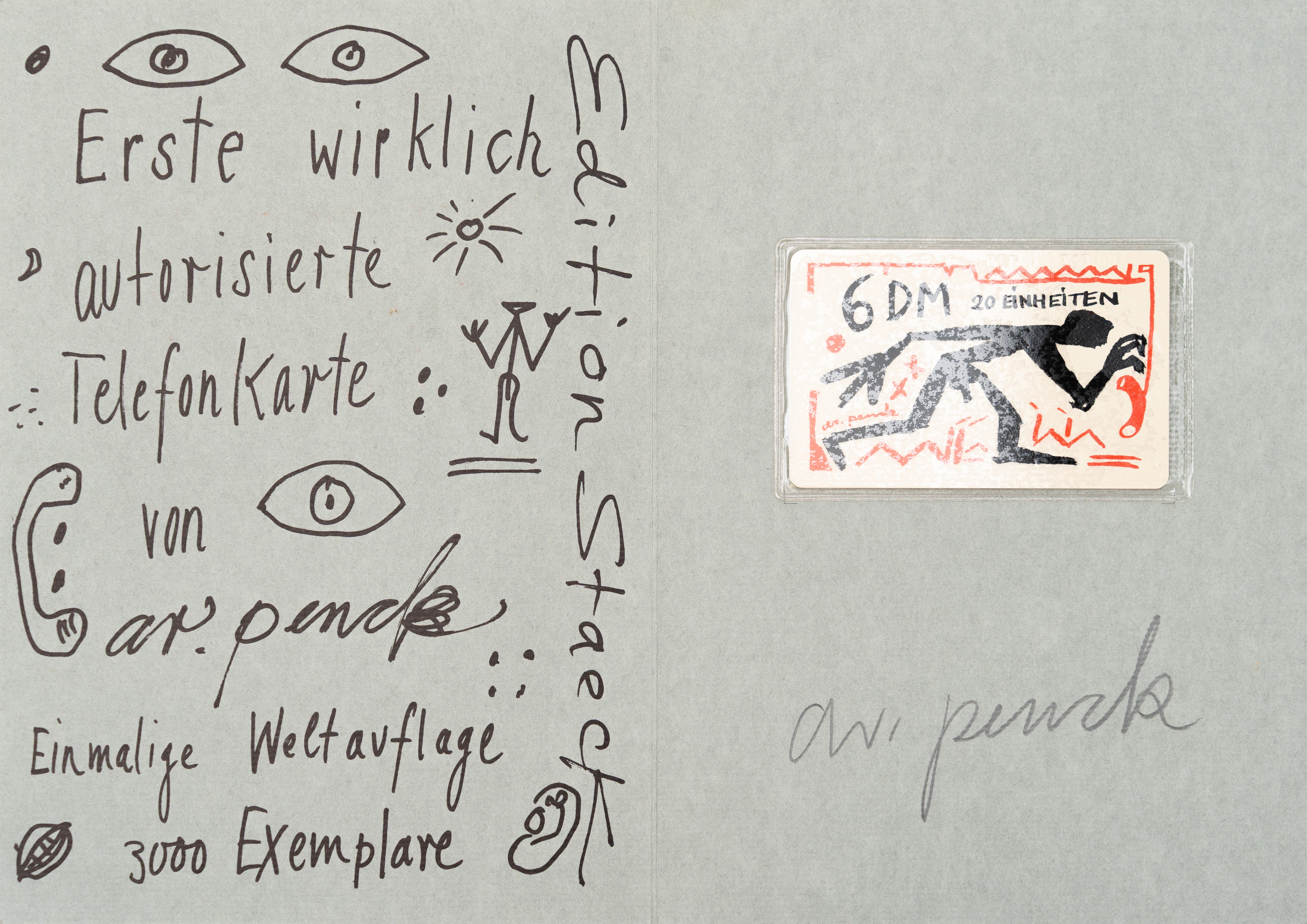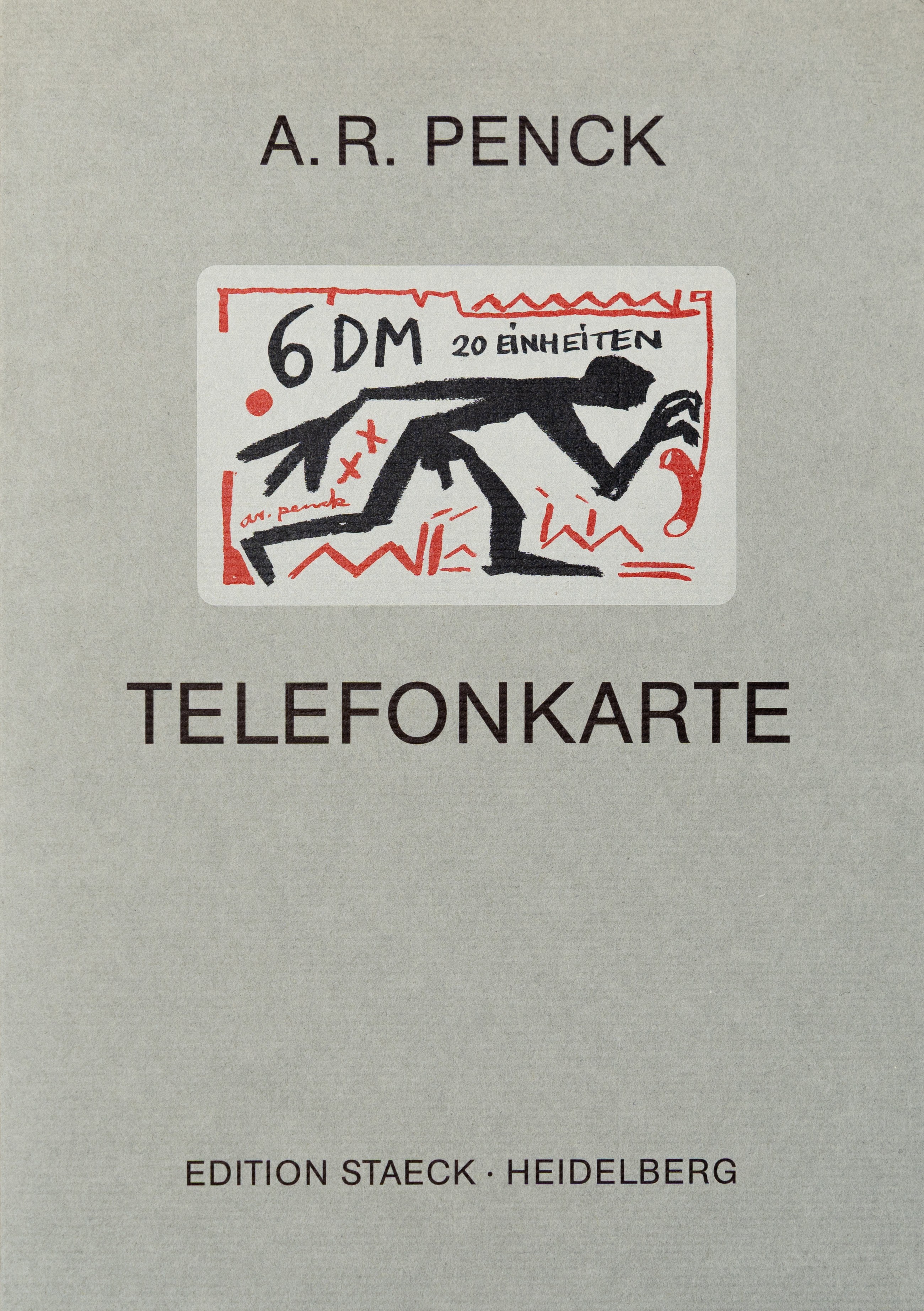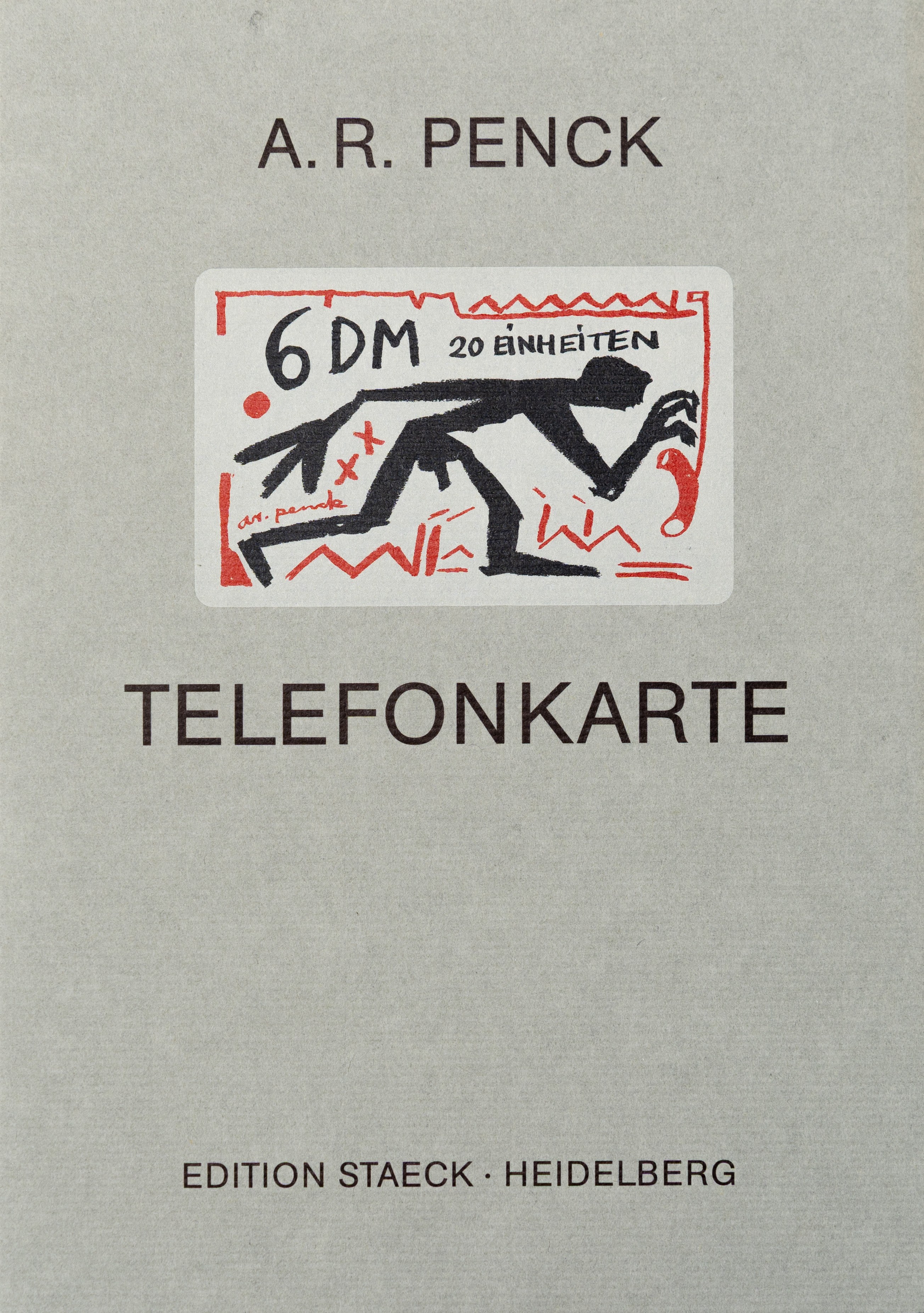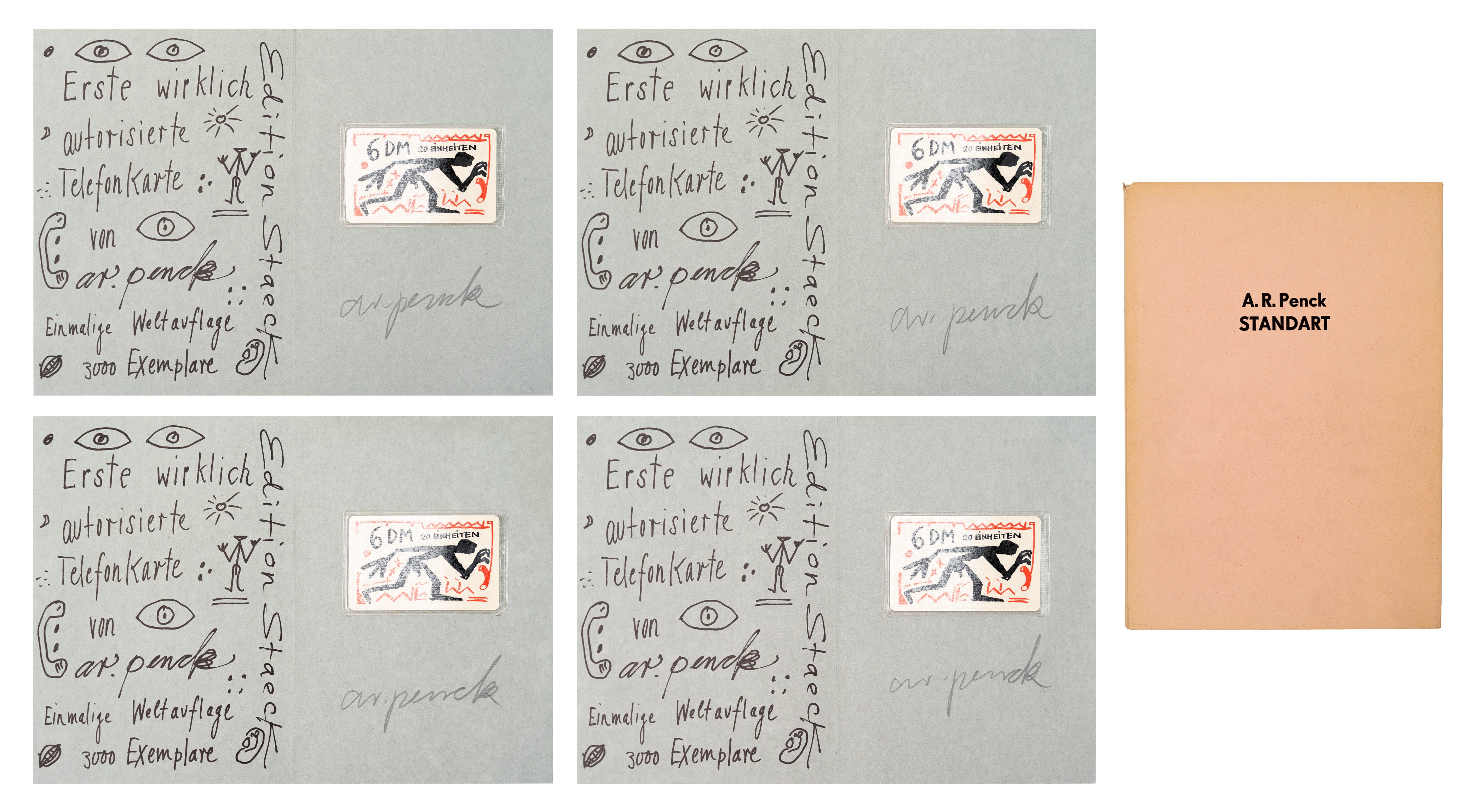 ''Telefonkarte'' (four works) and ''Standart'',offset on cardboard, plastic (''Telefonkarte''), reprint of ten related booklets 1971-73, Rainer Verlag, Berlin (''Standart''),21 × 29.7 cm (''Telefonkarte''), 25 × 18 cm (''Standart''),each signed (''Telefonkarte''), signed (''Standart''),1993 (''Telefonkarte''), 1985 (''Standart''),''Standart'' numbered 251/300,corners of the cover of ''Telefonkarte'' minimally rubbed, one cover slightly light-stained, plastic cards difficult to remove, cover of ''Standart'' light-stained and partially damaged, green pages light-stained, partial loosening of the binding, former price handwritten on the inside