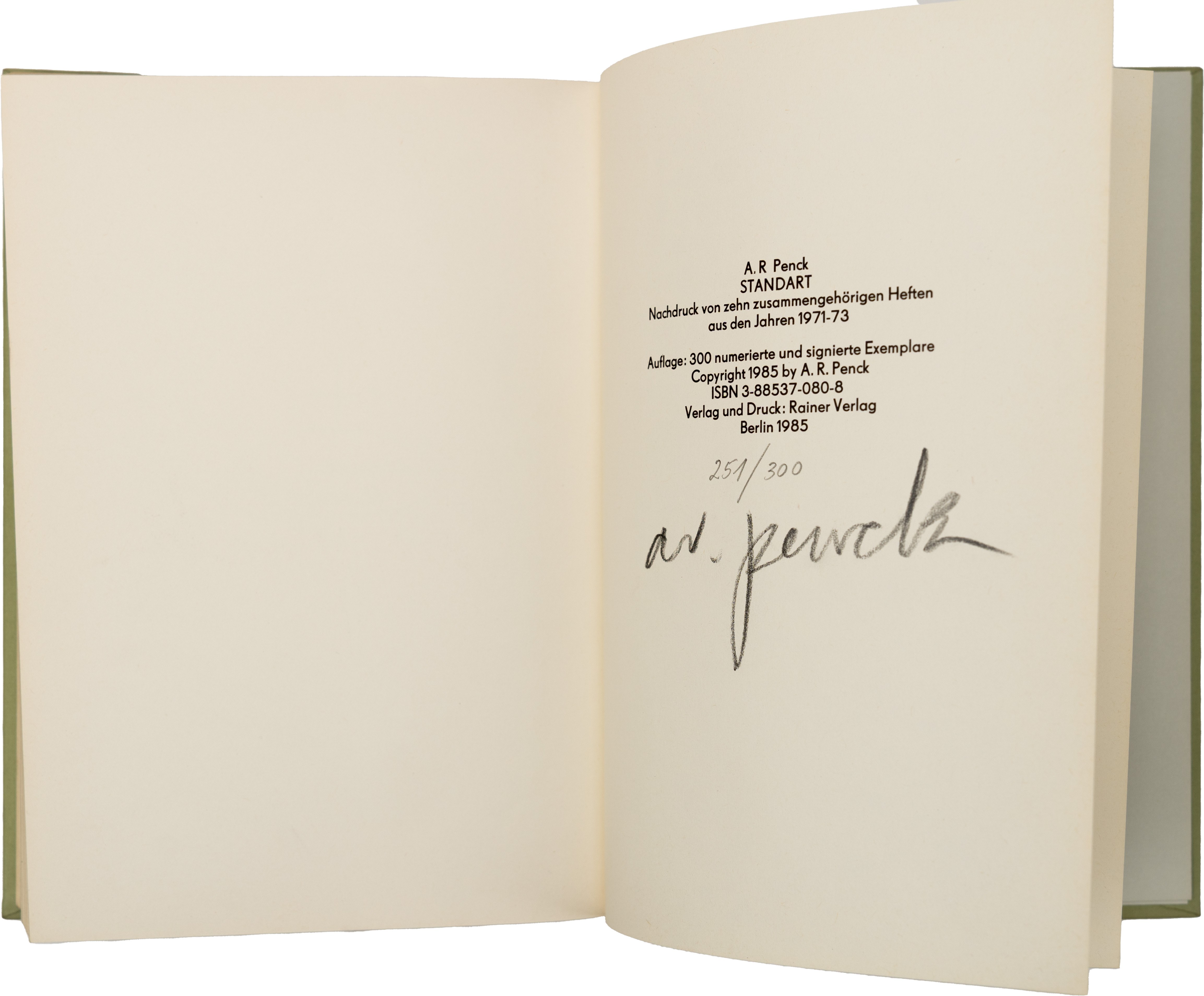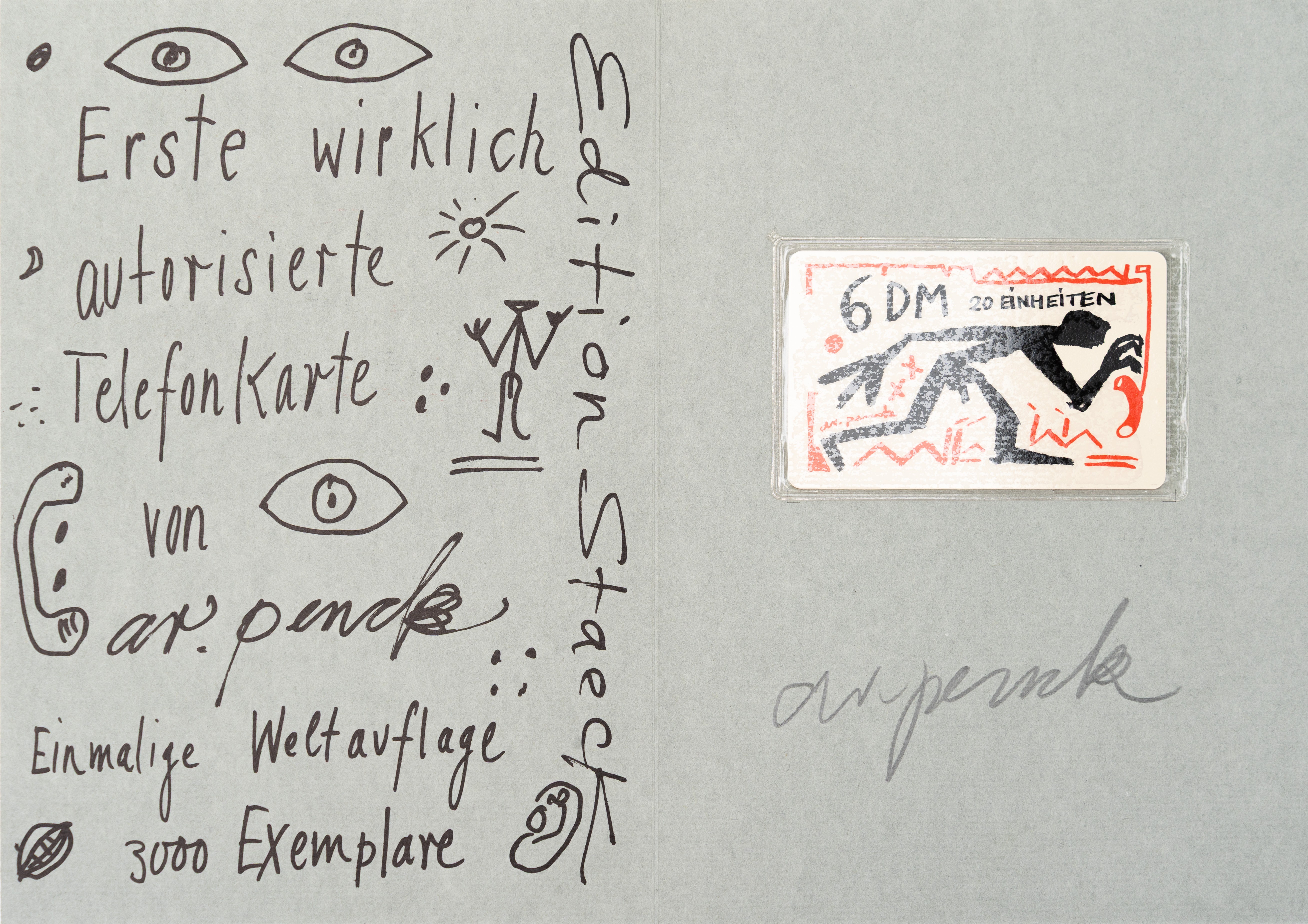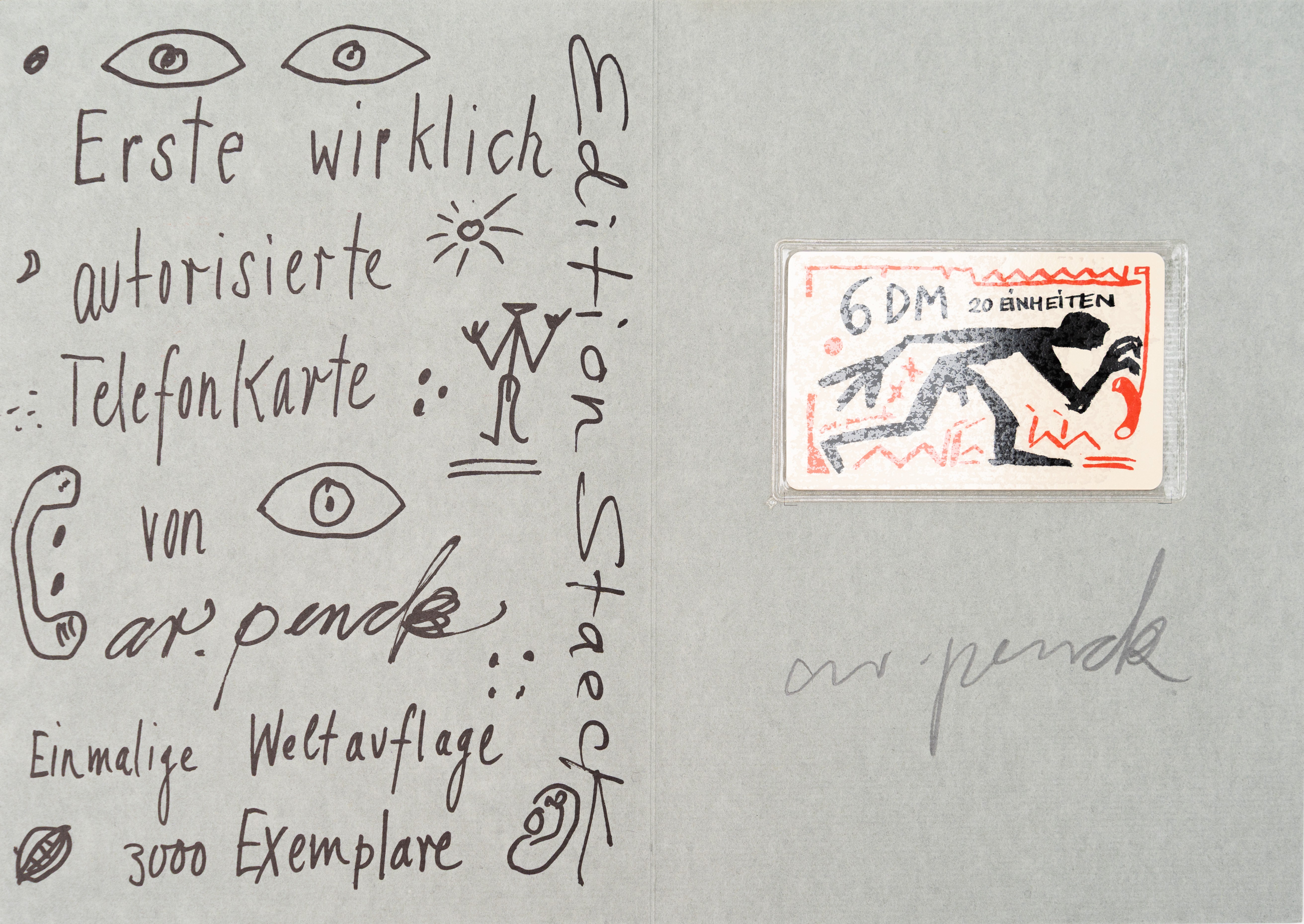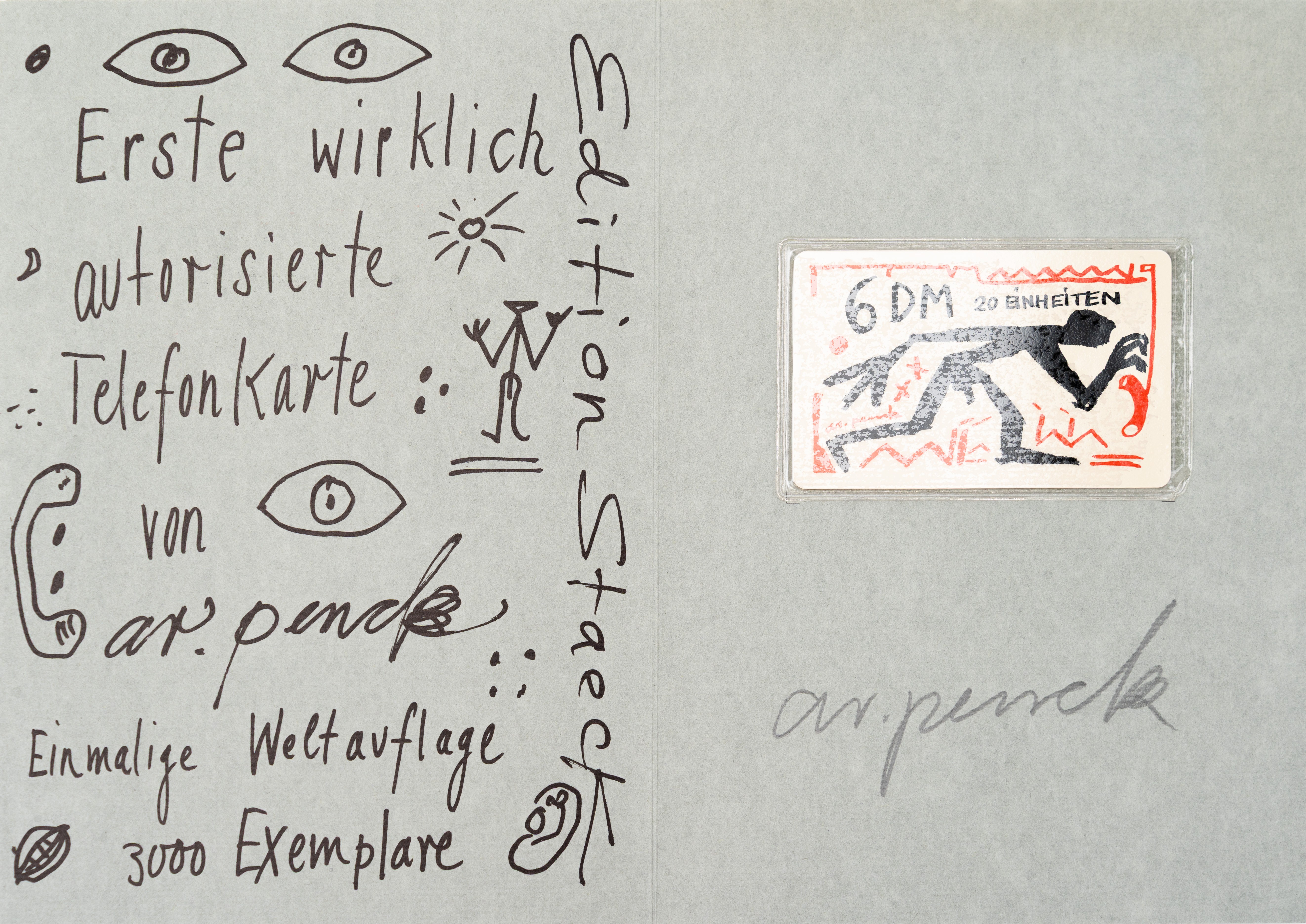''Telefonkarte'' (four works) and ''Standart'',offset on cardboard, plastic (''Telefonkarte''), reprint of ten related booklets 1971-73, Rainer Verlag, Berlin (''Standart''),21 × 29.7 cm (''Telefonkarte''), 25 × 18 cm (''Standart''),each signed (''Telefonkarte''), signed (''Standart''),1993 (''Telefonkarte''), 1985 (''Standart''),''Standart'' numbered 251/300,corners of the cover of ''Telefonkarte'' minimally rubbed, one cover slightly light-stained, plastic cards difficult to remove, cover of ''Standart'' light-stained and partially damaged, green pages light-stained, partial loosening of the binding, former price handwritten on the inside