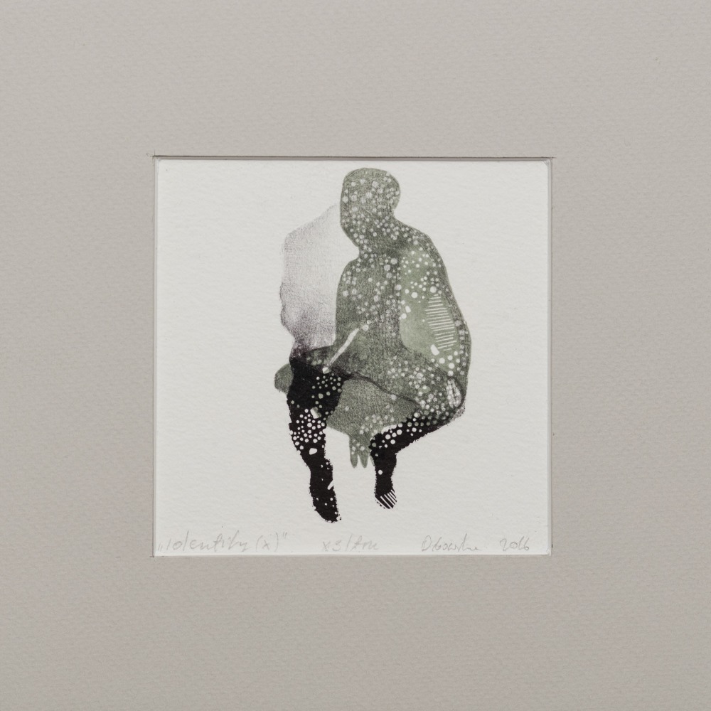 linoryt, technika mieszana, papier, 10x10 cmsygn. u dołu: „Identity (X)” A. Dybowska