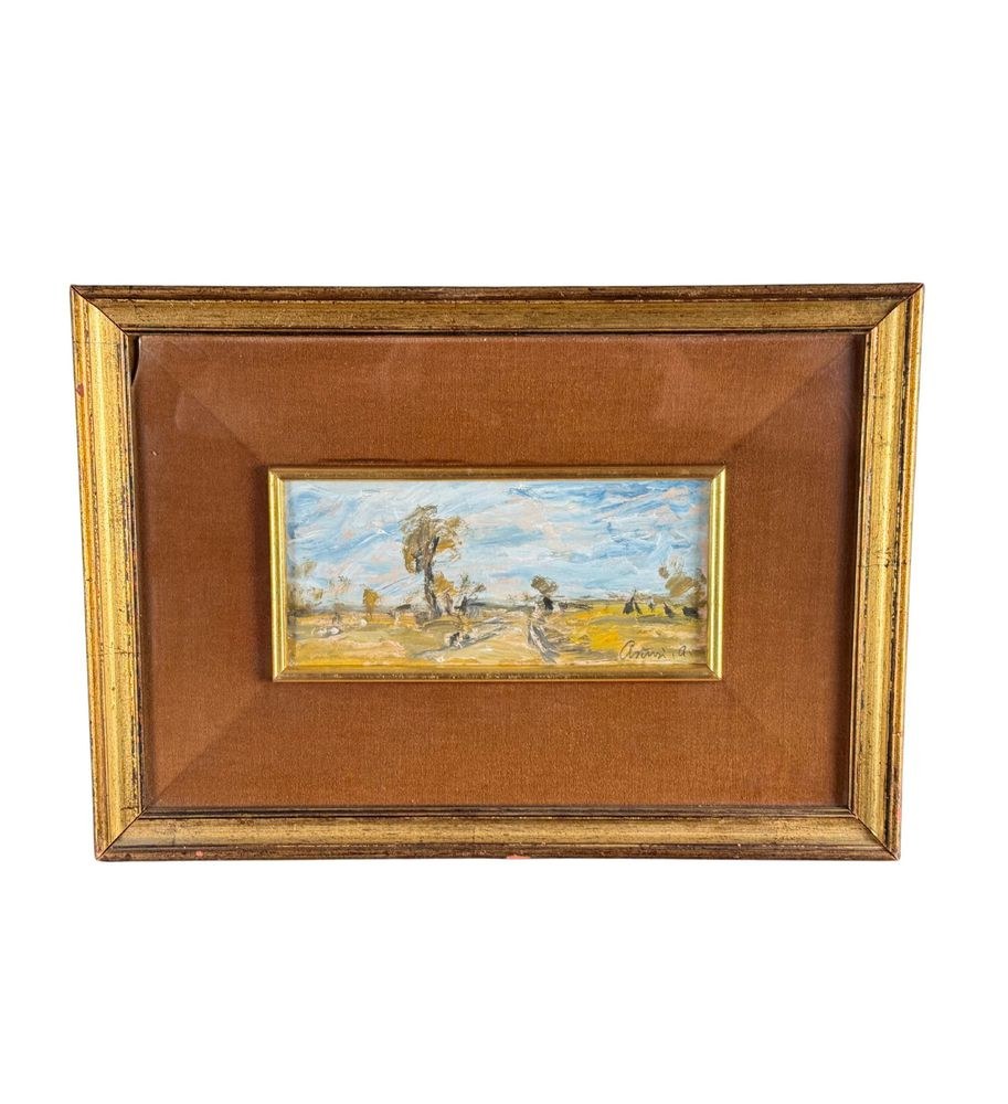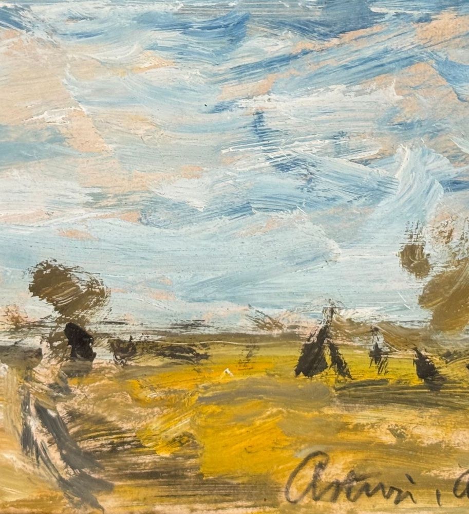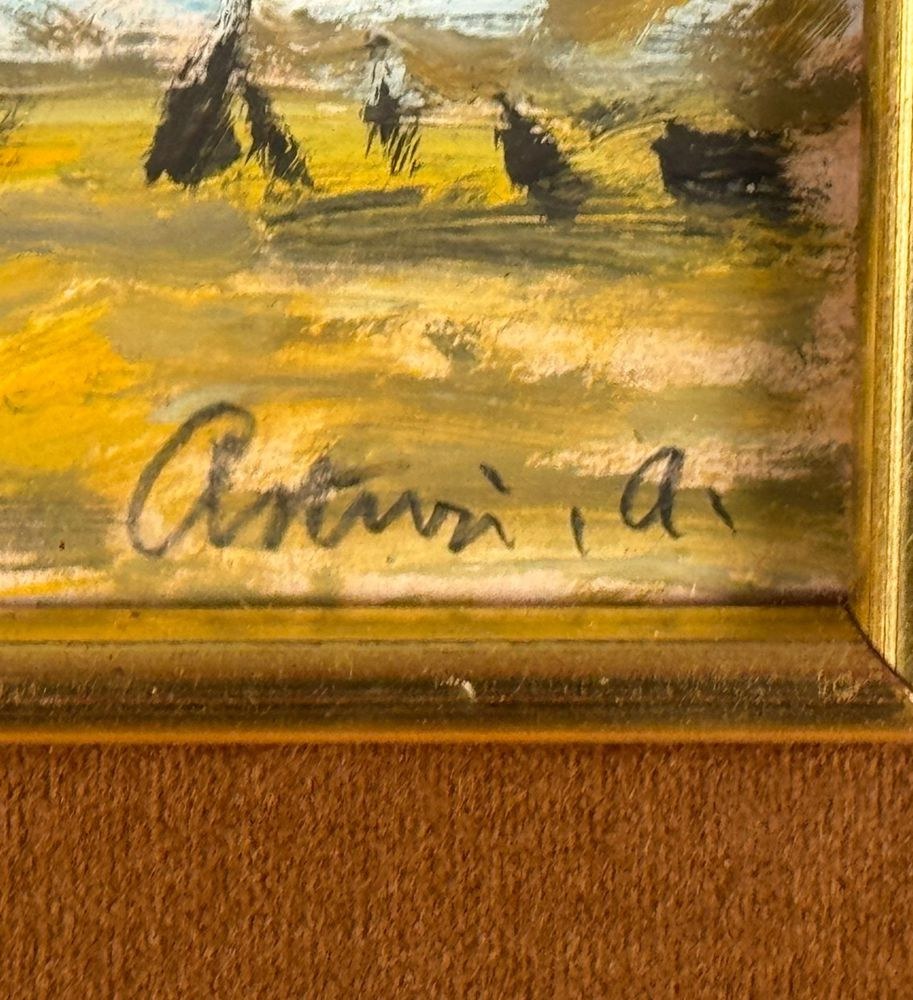 Oil painting on cardboard, 20th-century Italian school, depicting a landscape. Dimensions including frame: 41x29 cm. Dimensions within the frame: 22x10 cm. Signed lower right: Antonio Asturi. The work is in good condition.