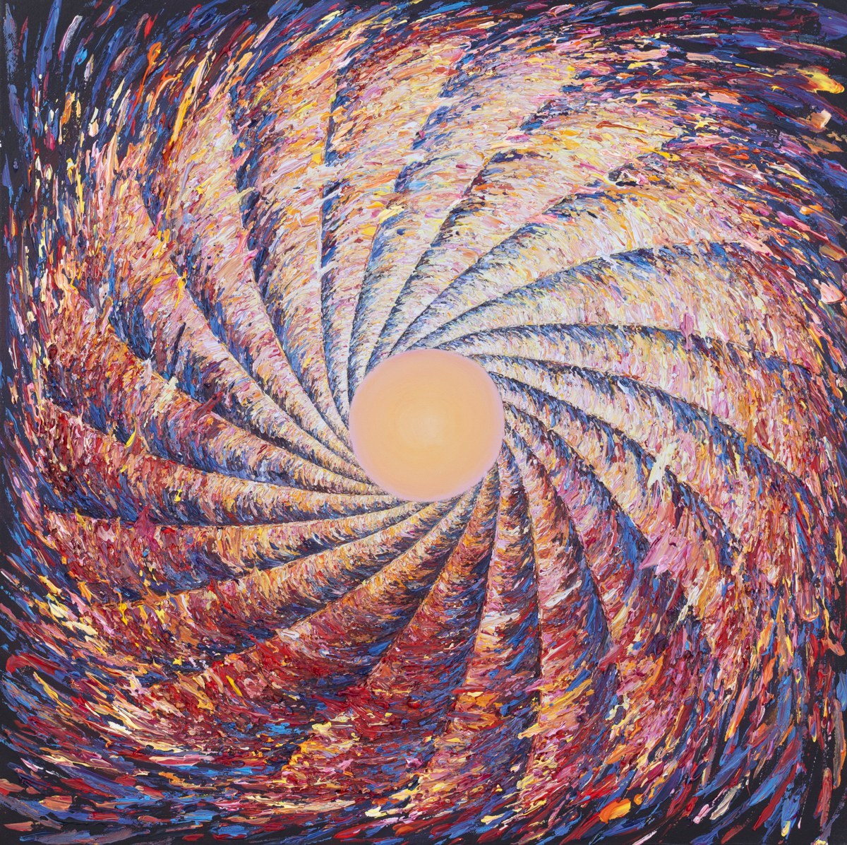 akryl, płótno, 70x70 cm, opisany na odwrocie: Magdalena Barczyk-Kurus 2025 ,,Here comes the sun II'' cykl: ,,Intymność światła''
