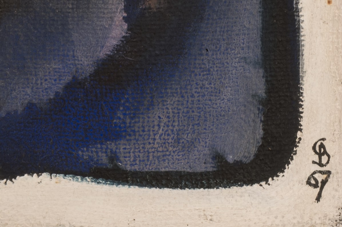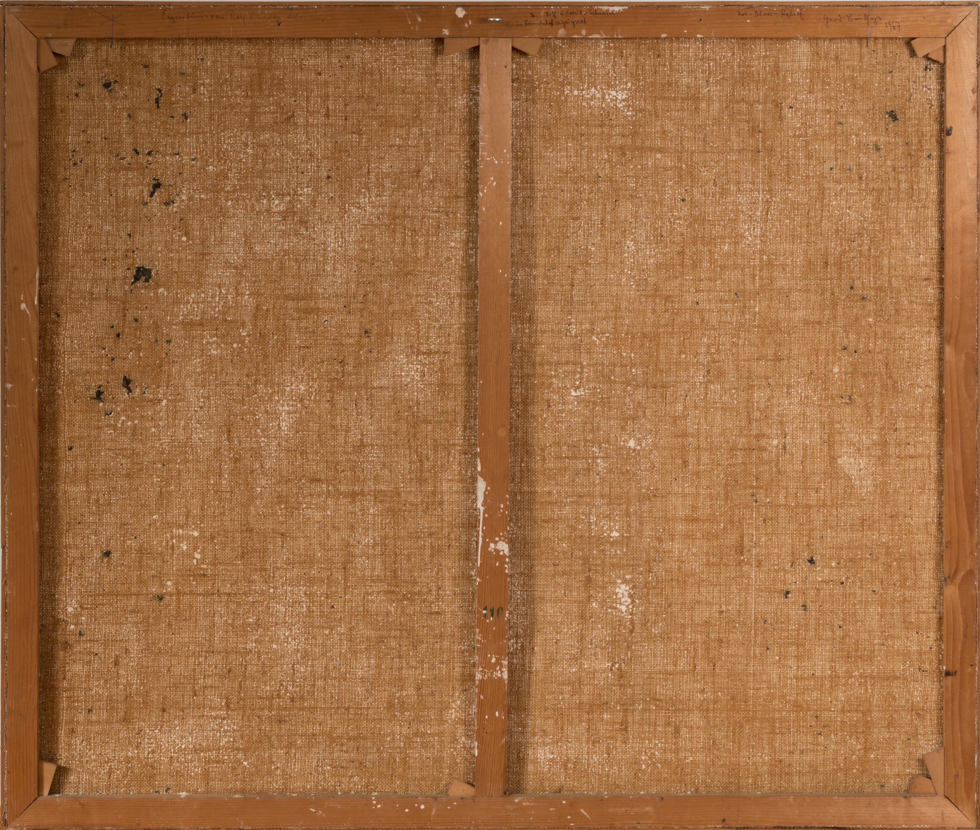 'Red-Blue Relief', mixed media on canvas, 110 cm x 130 cm canvas dimensions, monogrammed, dated 67, signed on verso, dated, titled, dedicated 1967, partially minimally stained