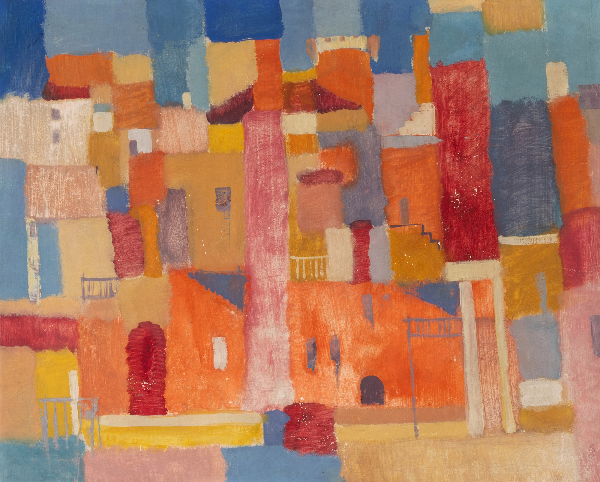 Mediterranean city view, mixed media paper mounted on chipboard, 48 cm x 59.5 cm work size, monogrammed, 61 dated, paper glued over the entire surface, partial color losses, provenance: acquired directly from the artist