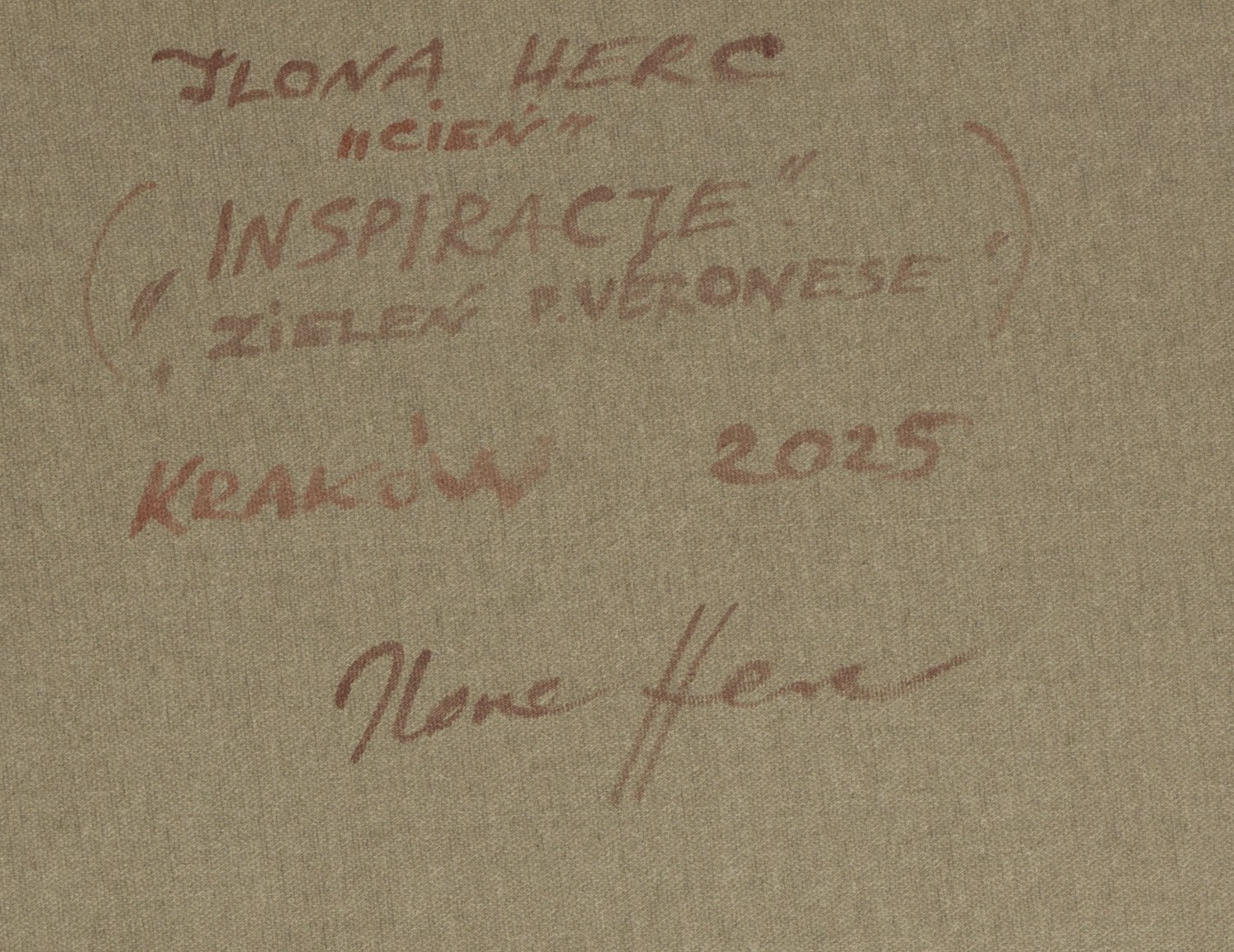 sygnowany, datowany i opisany na odwrociu: 'ILONA HERC | "CIEŃ" | "INSPIRACJE" | "ZIELEŃ P. VERONESE" | KRAKÓW 2025 | Ilona Herc'