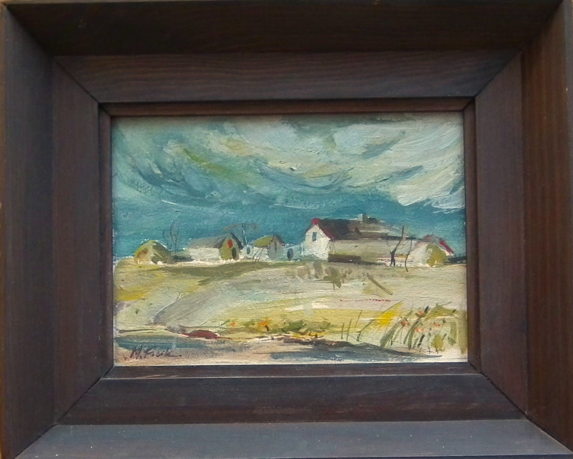 olej na płycie,13x18cm w świetle oprawy,sygn.l.d.M.Fiuk,praca opisana z tyłu