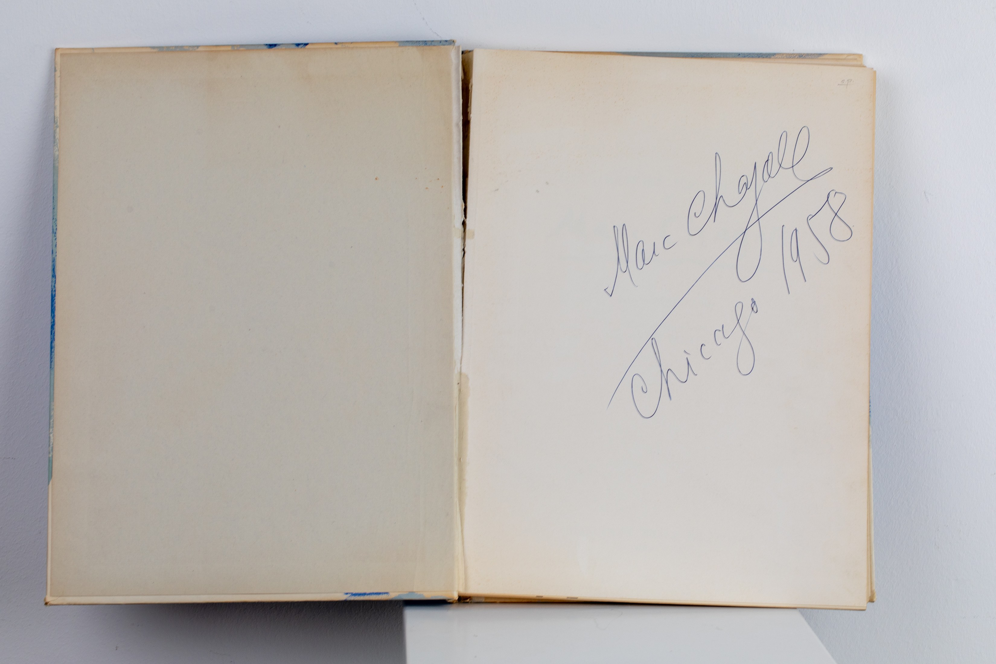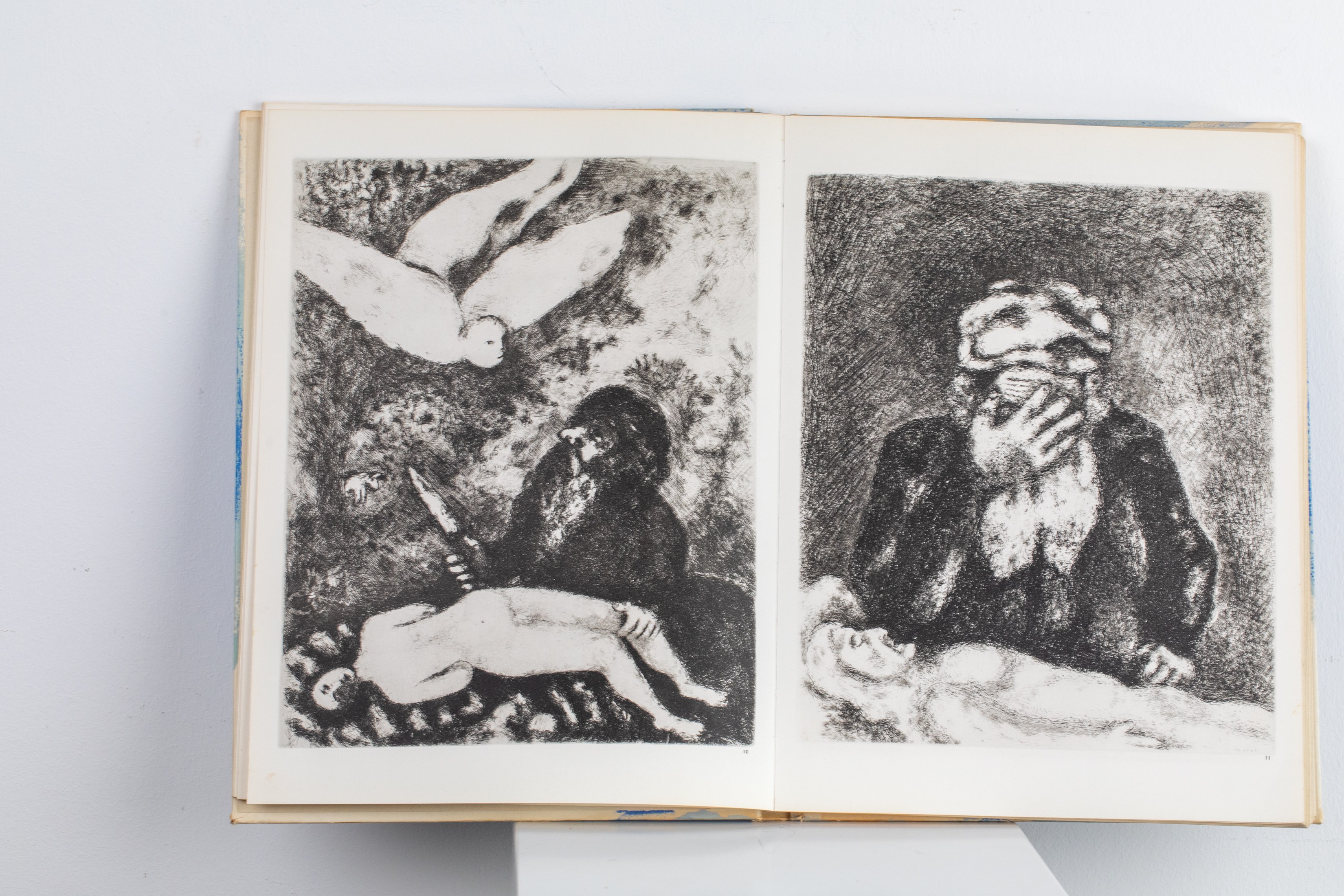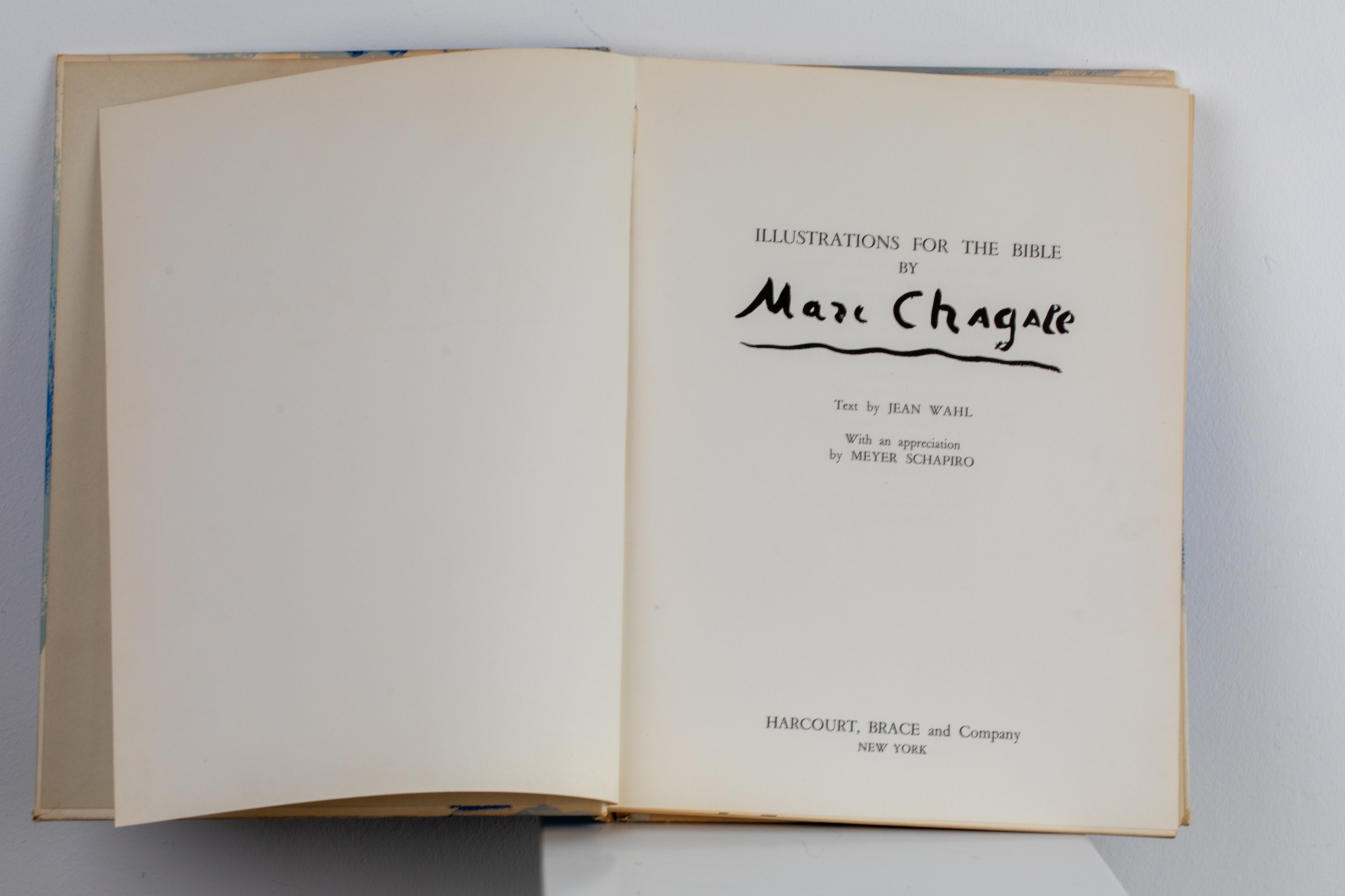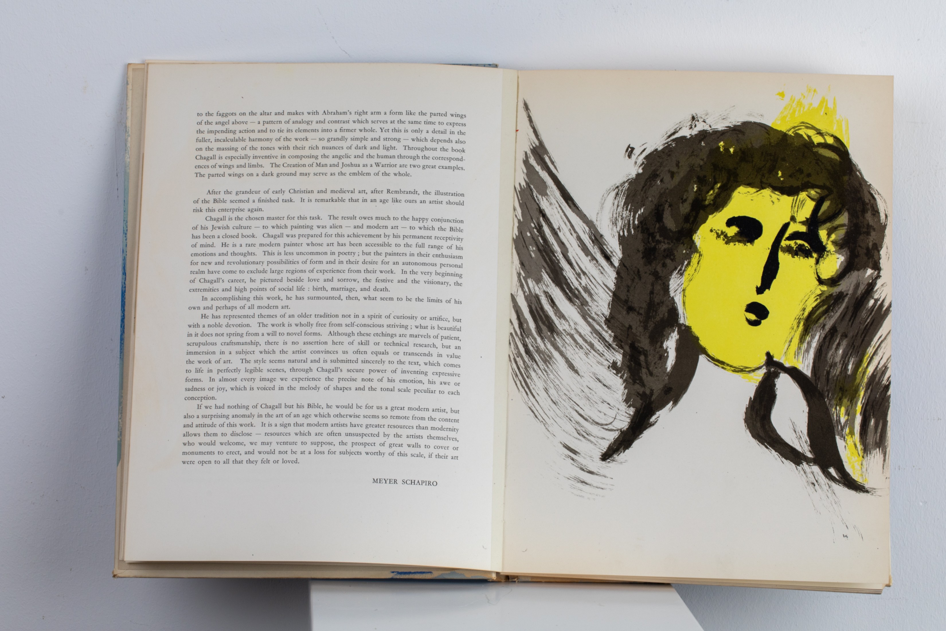 Illustrations for the Bible by Marc Chagall, New York: Harcourt, Brace and Company 1956, with 105 heliogravures after the complete etching cycle ''Illustrations for the Bible'' together with 16 colour and 12 black-and-white lithographs, printed at Mourlot, signed on the front endpaper ''Marc Chagall / Chicago 1958'', 36.5 cm × 27 cm, binding loose and partly broken, cover with edge wear, yellowed, partially soiled