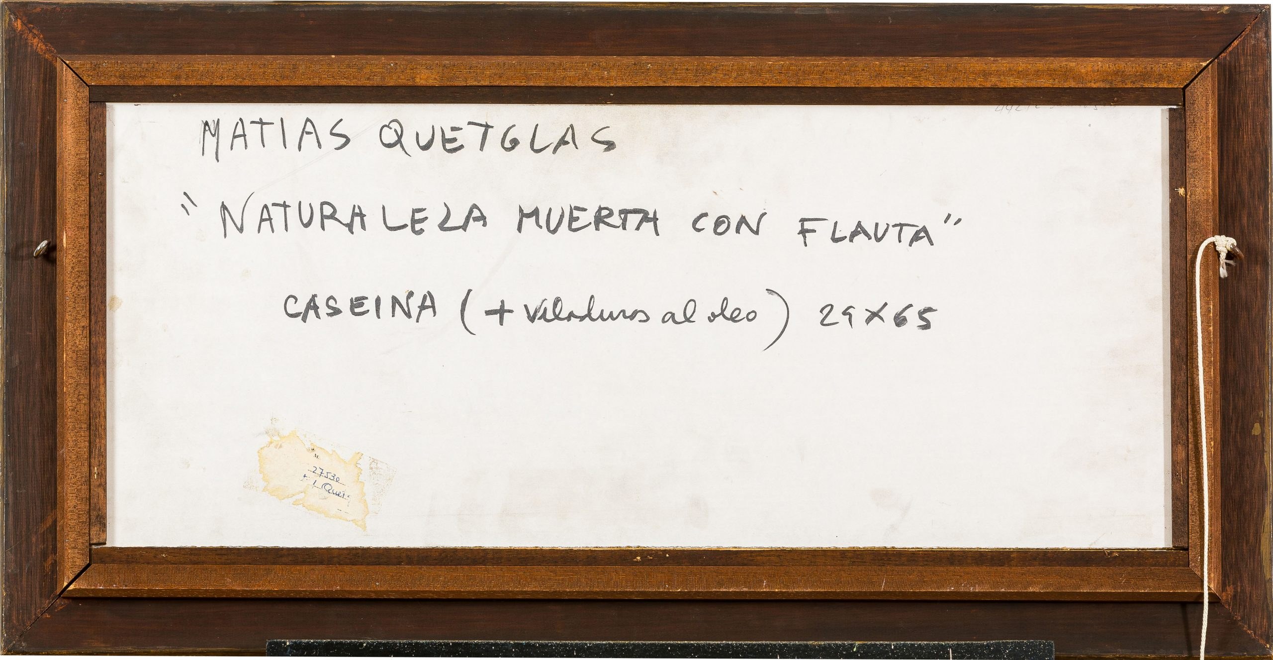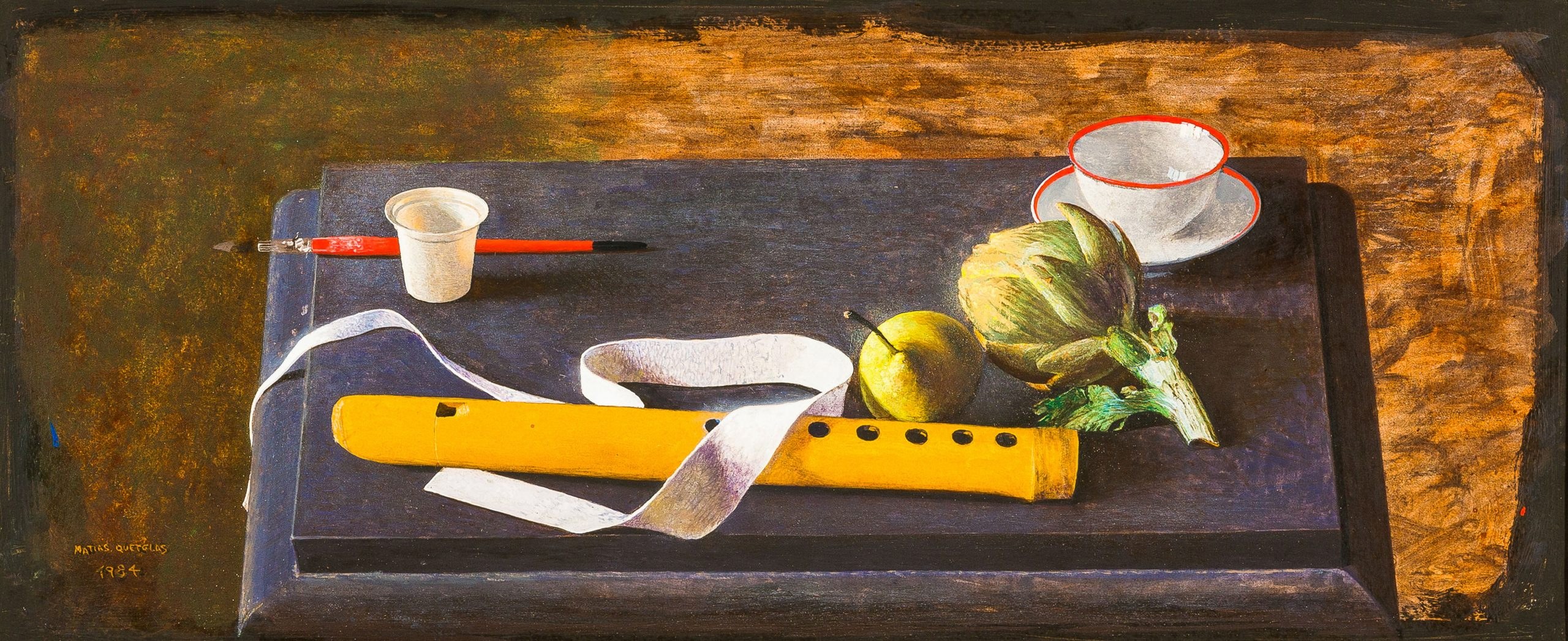 'Naturaleza Muerta con Flauta', acrylic on panel, 29 cm x 65 cm, signed, dated 1984, verso signed, titled