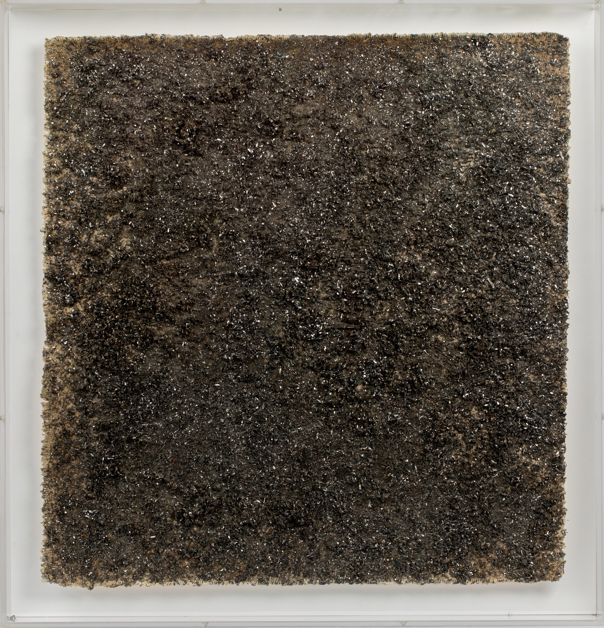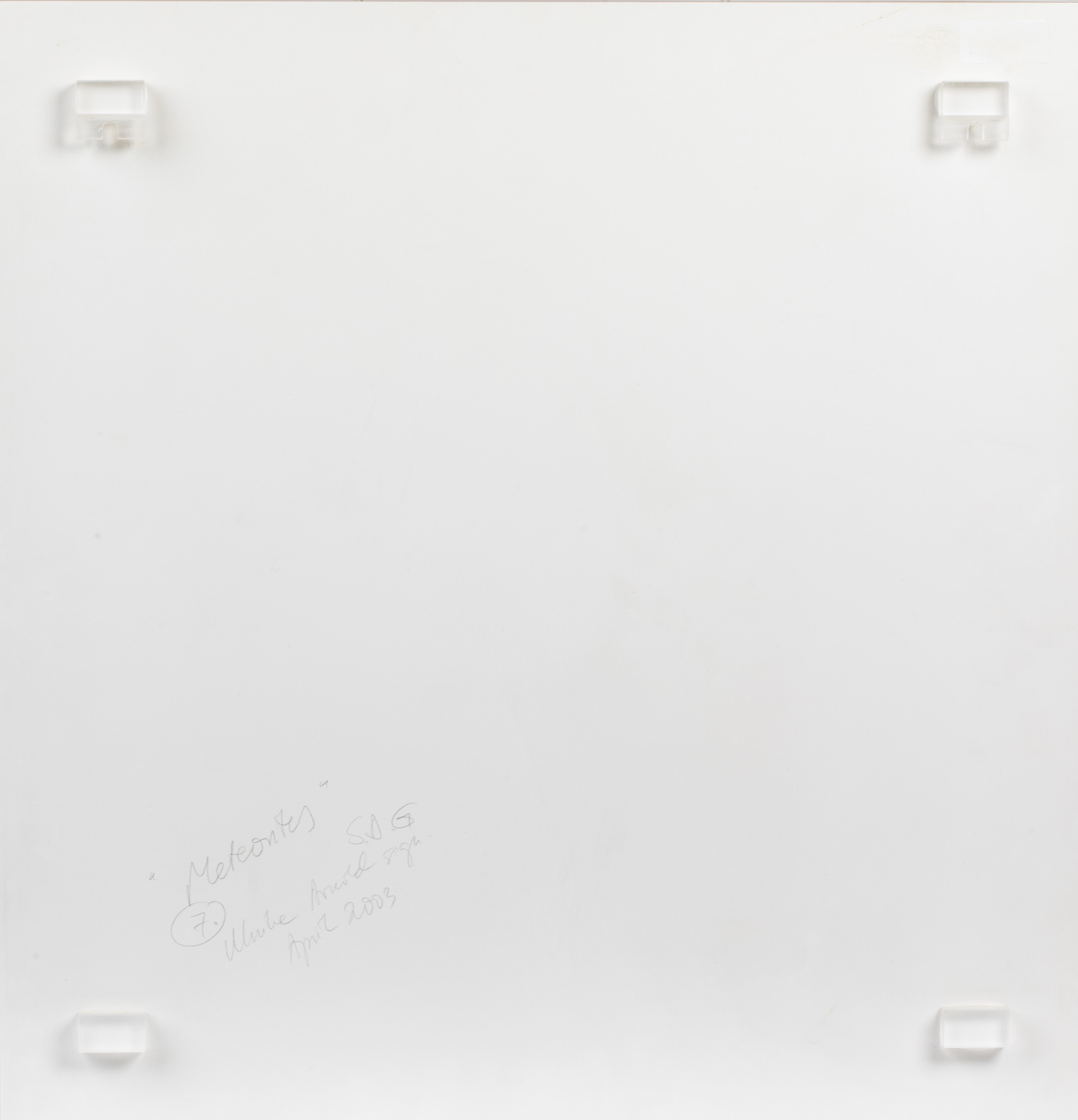 'Meteorites 7', mixed media with meteor dust on twill-woven textile support, signed ''Ulrike Arnold'' on the reverse and dated April 2003, inscribed ''S. D. G.'' (Soli Deo Gloria), 40 cm × 38 cm, 44 cm × 45.5 cm with plexiglass frame, mounted