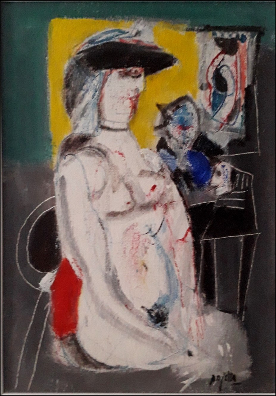 PAJETTA GUIDO Monza 1898 - Milano 1987 "Nudo seduto con cappello nero" Acrilico su tela cm 50x70 del 1971. Opera firmata sul fronte, in basso a destra. Autentica ed archivio su foto. Opera pubblicata a pag. 1015 del "catalogo generale ragionato dei dipinti" (vol. II) edito da Mazzotta/Crispolti.