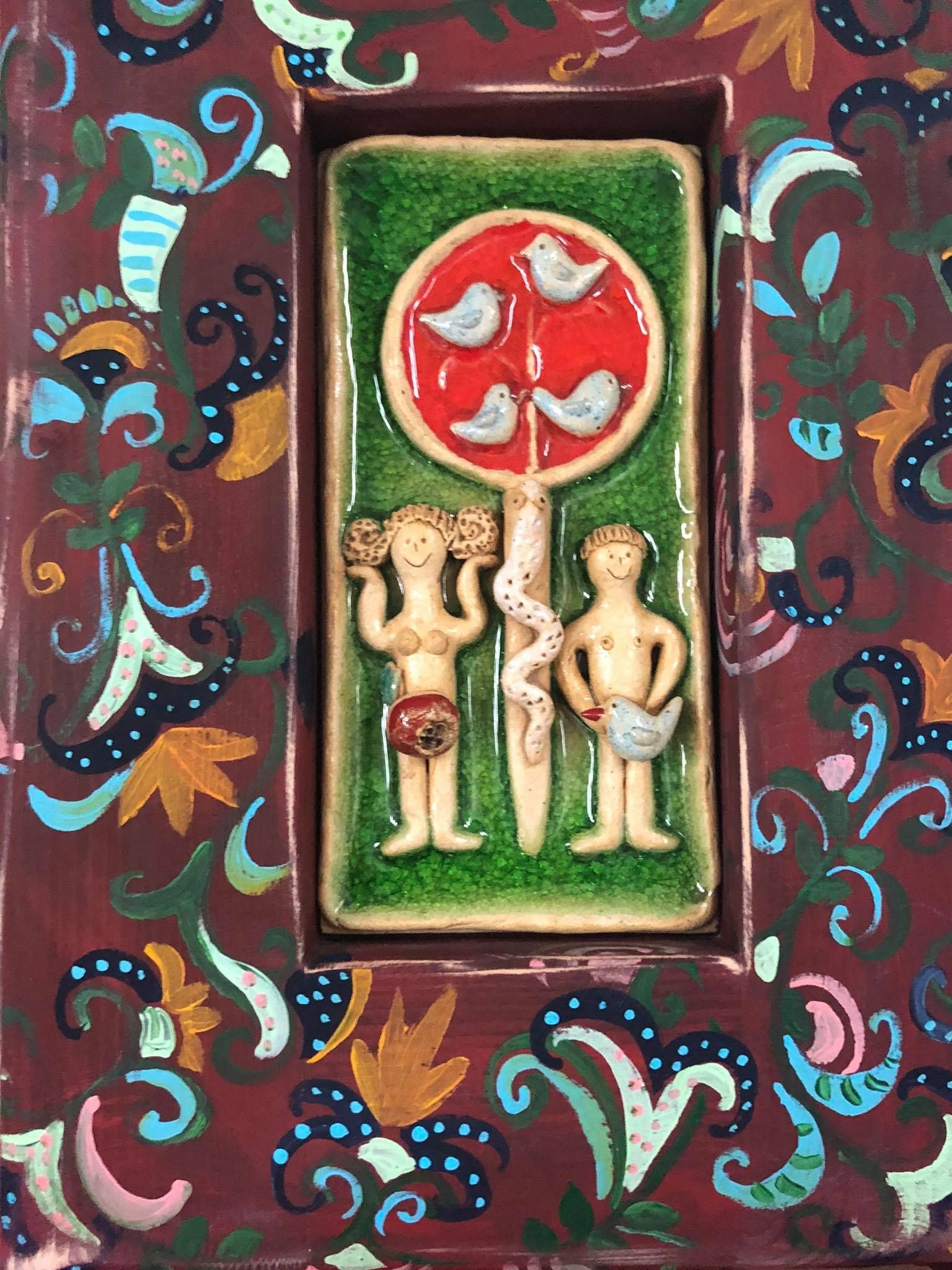 Autor: Beksa KrzysztofTytuł: Raj Data: nieznanaWymiary: 45 x 33 cmTechnika: drewno, ceramika