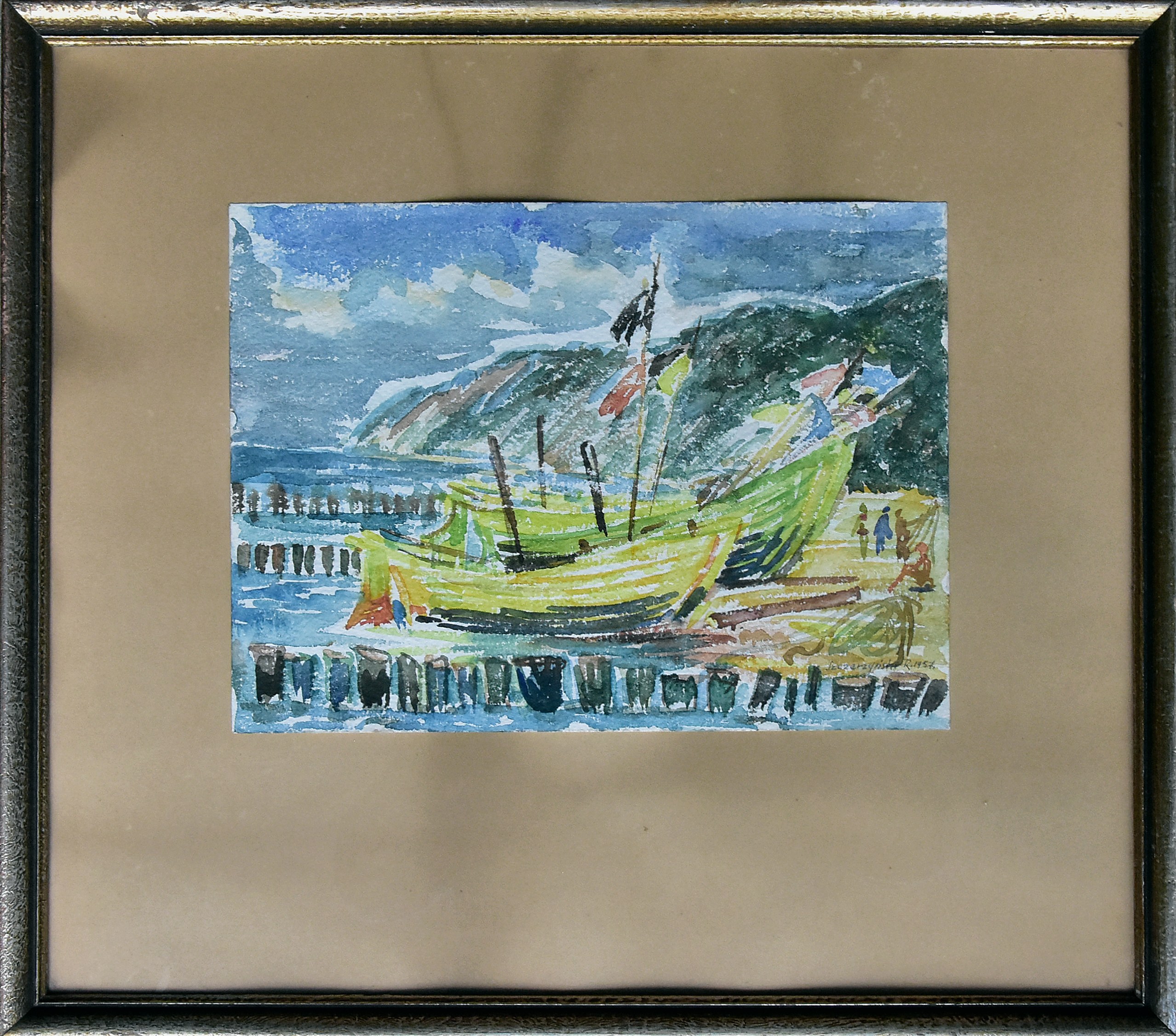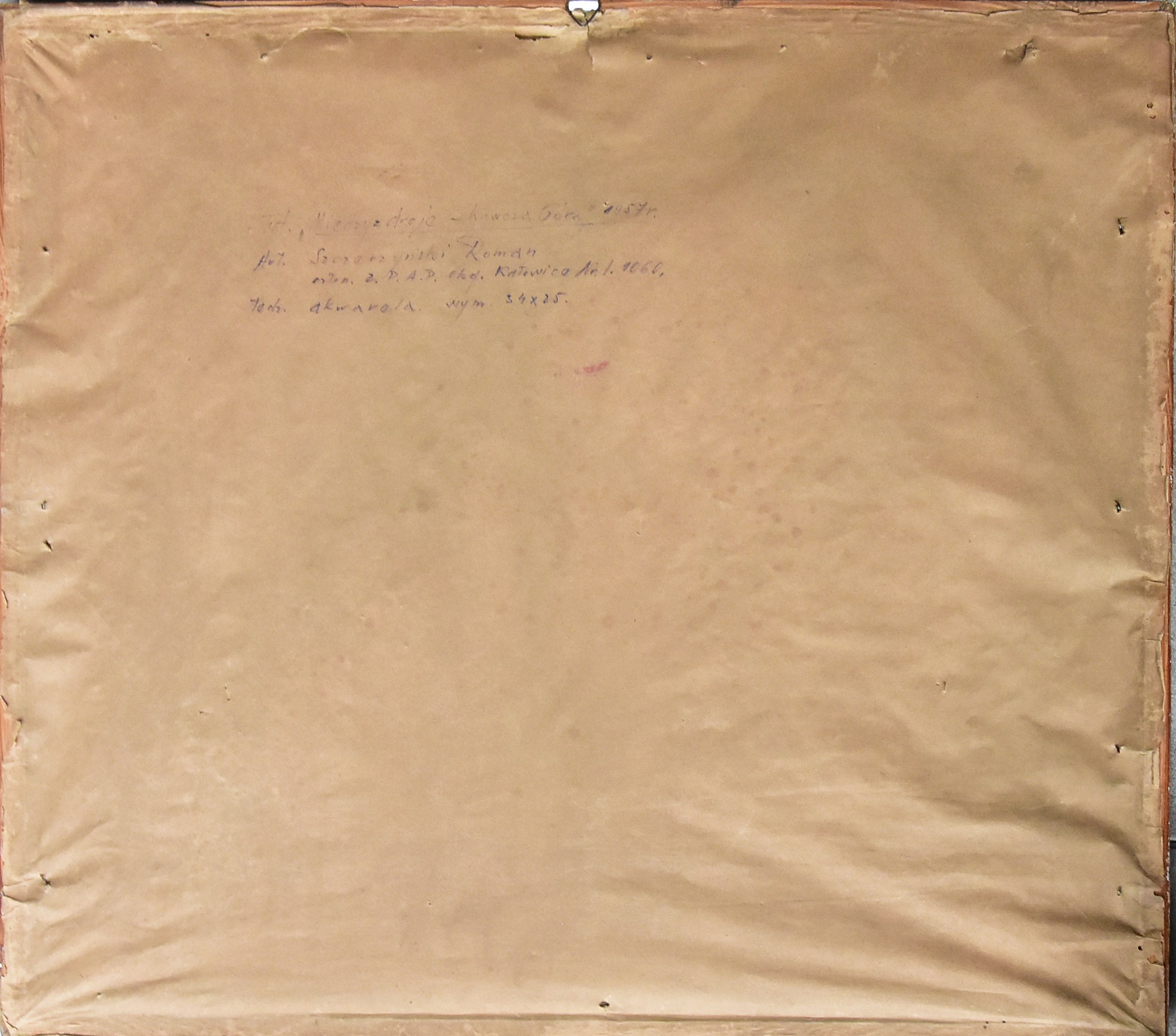 Na odwrocie opis autorski: Tyt. "Miedzyzdroje - Kawcza Góra / Aut. Szczerzyński Roman / człon. ZPAP okręg w Katowicach No. l. 1060 / techn. akwarela, wym. 34 x 25.
