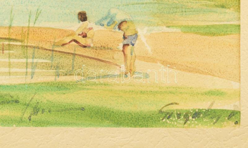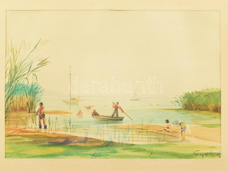Szegedy jelzéssel: Balaton vitorlásokkal és fürdőzőkkel. Akvarell, papír, paszpartuban, 22×32 cm.