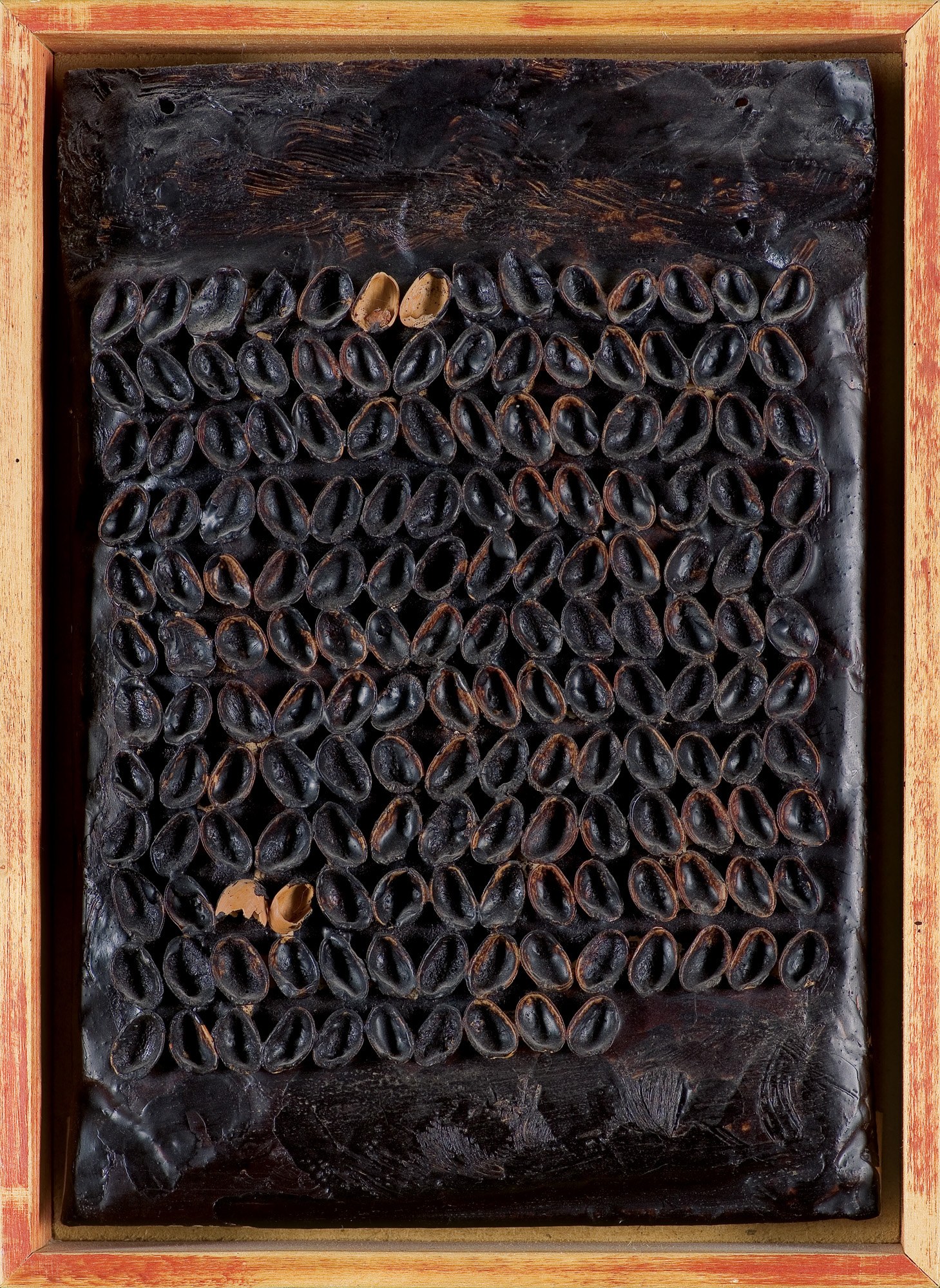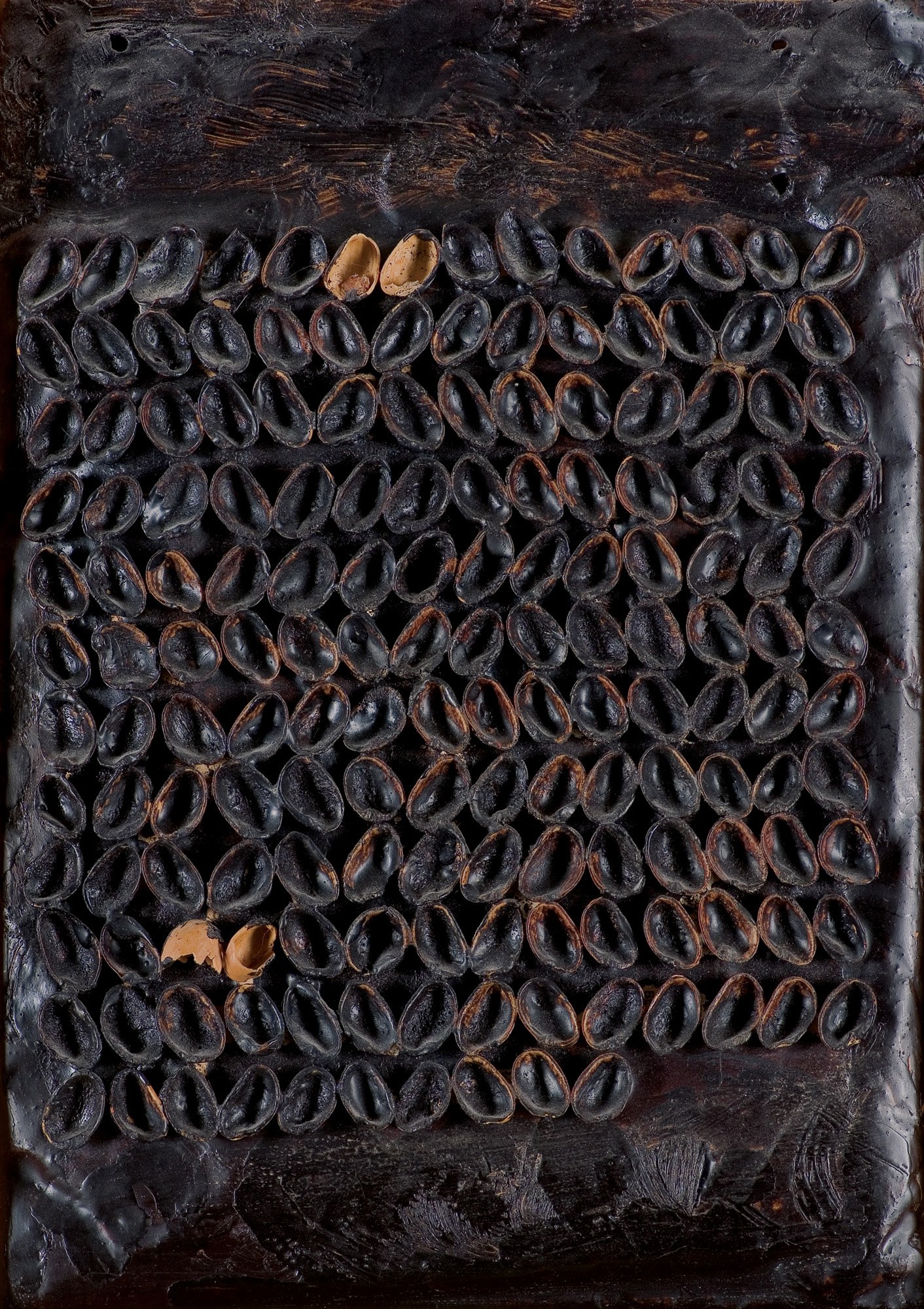 31,0 x 22,0cm - łupiny pistacji, enkaustyka, użyta koperta, płyta