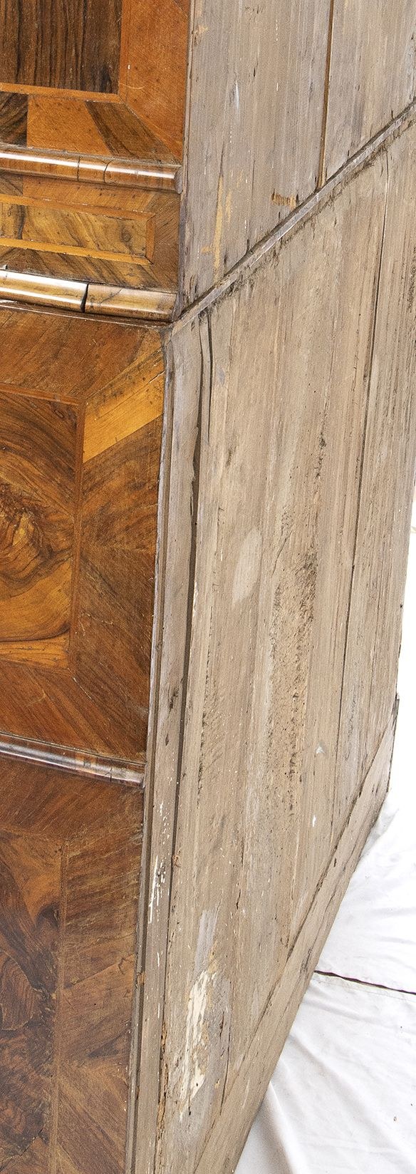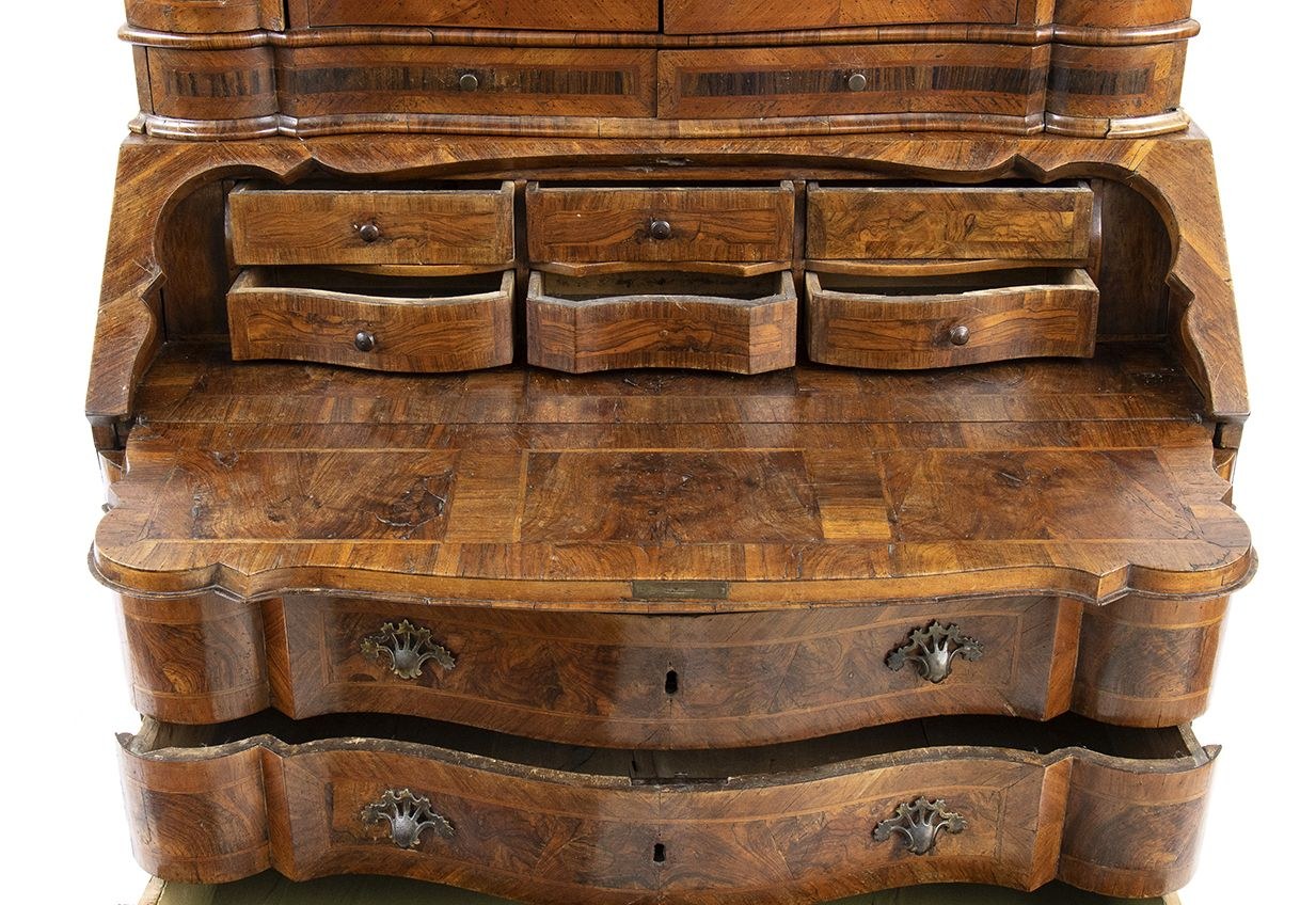 Veronese trumeau - 18th century, provenance Prince Giovanelli, walnut panelling on a poplar frame. The cabinet has two bodies, the upper part with two mirrored doors and two hidden doors on the sides. The lower body with 4 drawers plus a hidden drawer at