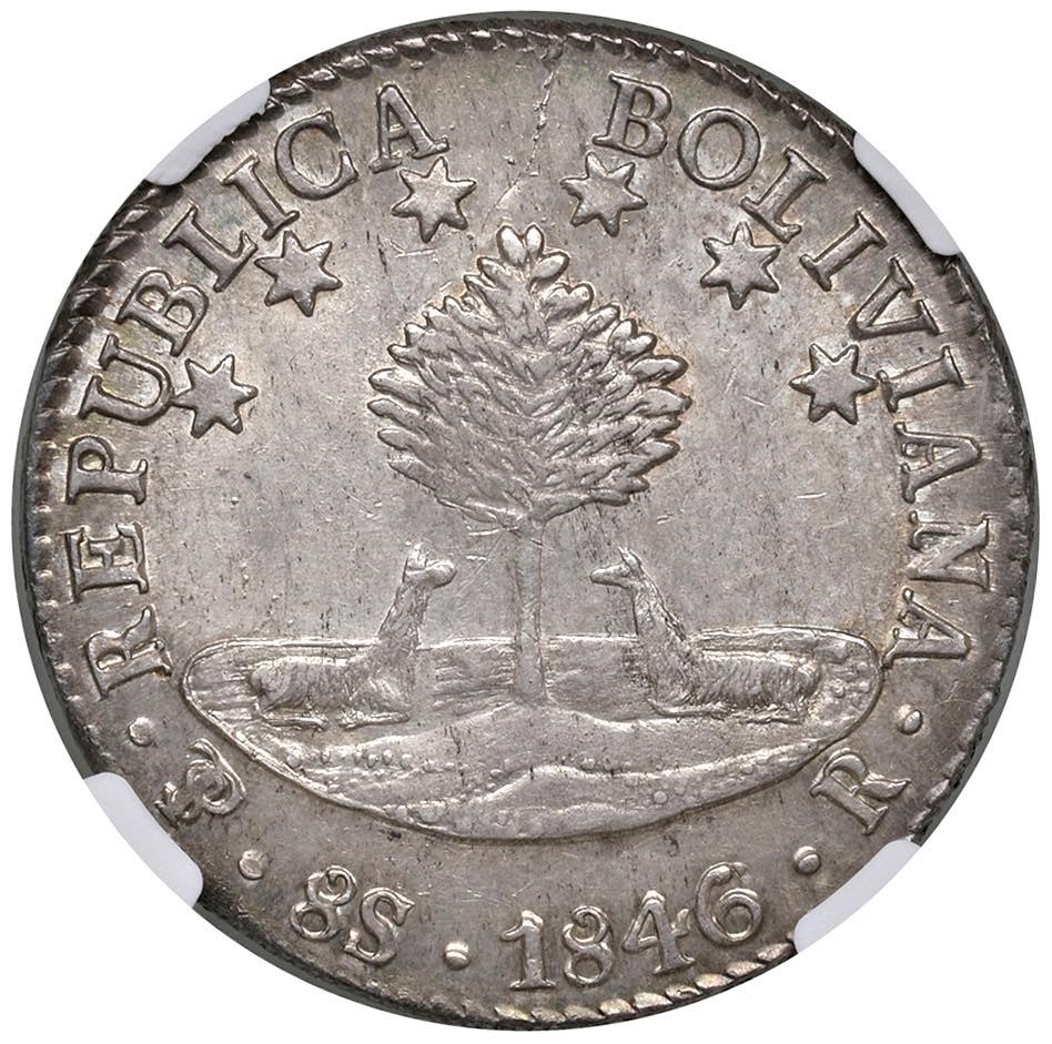 BOLIVIA Repubblica 8 Soles 1846/5 - KM 103 AG (g 26,78) TOP POP, in slab NGC MS 62 n° 8217328-005.