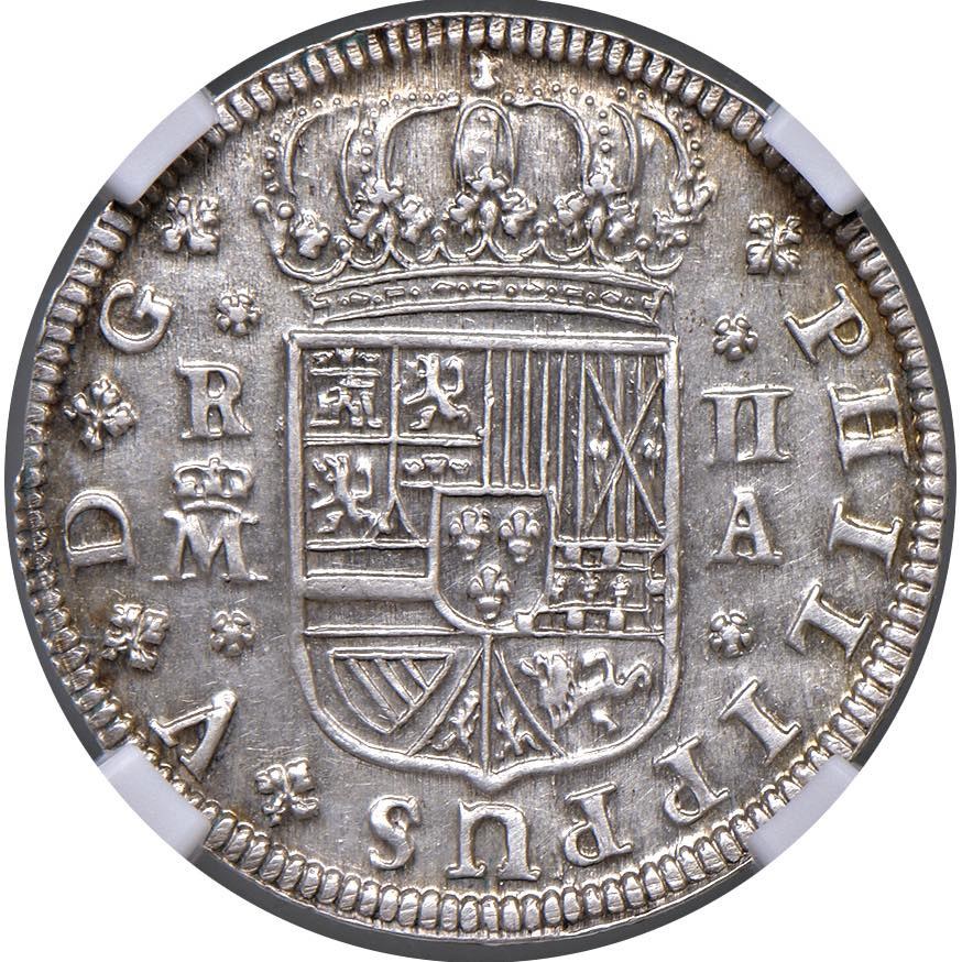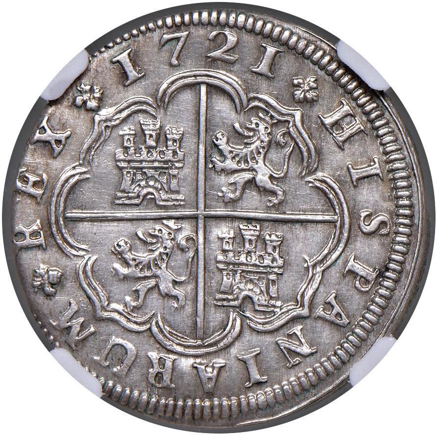 SPAGNA Filippo V di Borbone (1700-1746) 2 Reales 1721 M A - KM 296 AG (g 5,20) In slab CCG MS 63 n° AB236822. Nell'asta Tauler & Fau 145 del 2024, lotto 254, un esemplare in slab NGC MS 62 ha realizzato € 350 + diritti.
