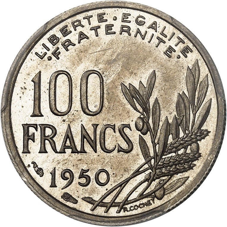 Rv. LIBERTE. EGALITE. FRATERNITE. Bouquet composé de trois épis et de deux branches d’olivier à droite. Sur la gauche 100 FRANCS (date) ; signature R. COCHET.