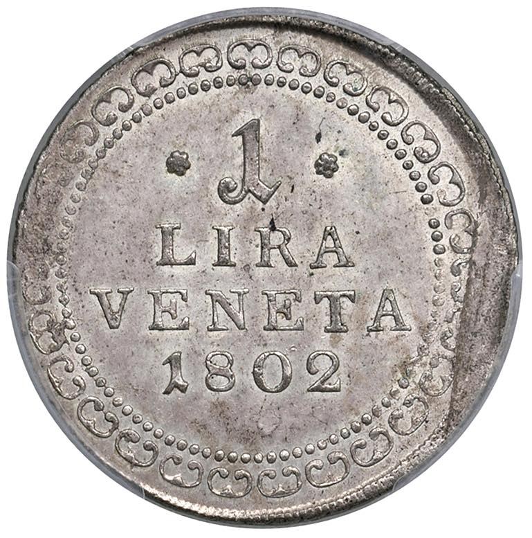 VENEZIA Francesco II d'Asburgo Lorena (1797-1805) Lira 1802 V - Gig. 9 MI TOP POP, in slab PCGS MS 63 n° 51845733.
