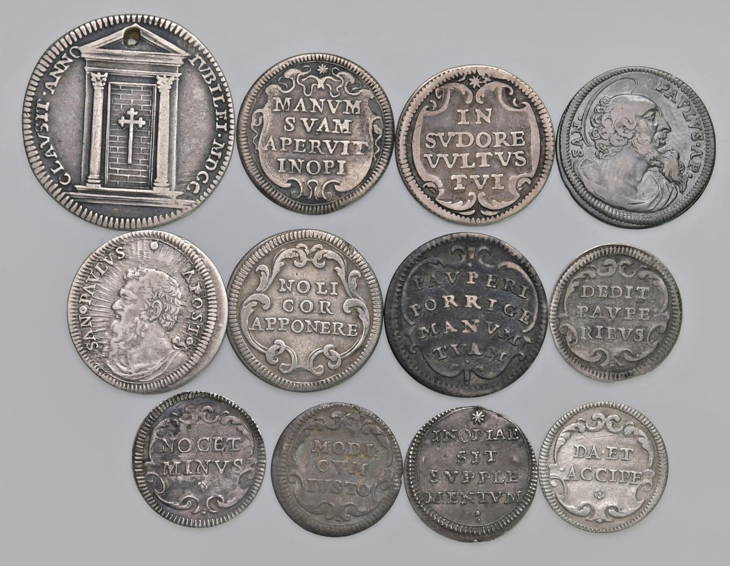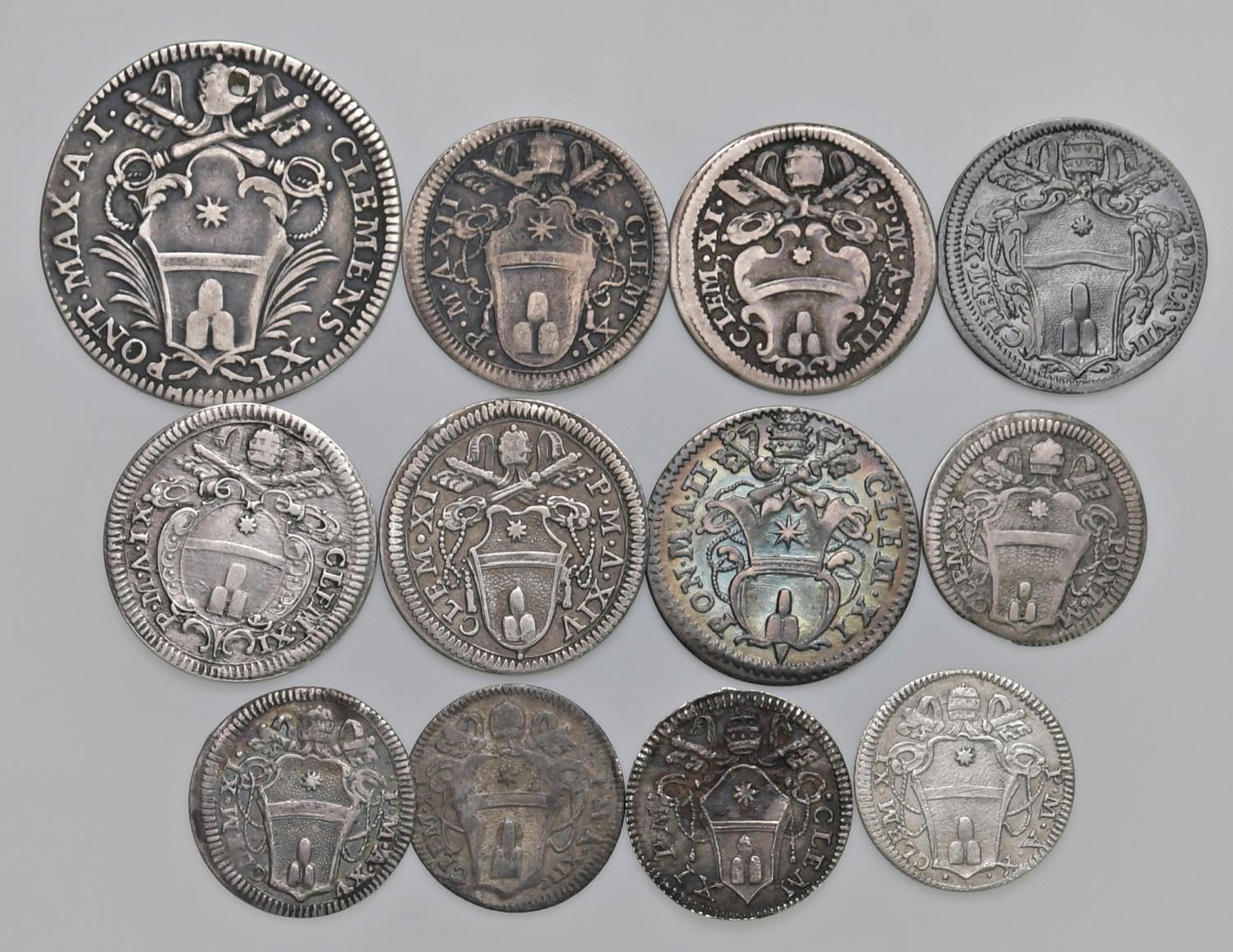 Clemente XI (1700-1721) Resto di collezione composto da 12 monete d'argento: 1) Giulio 1700 An. I - Munt. 85 AG (g 2,83) RR Foro; 2) Grosso An. IV - Munt. 130 AG (g 1,43) R; 3) Grosso An. XII - Munt. 135 AG (g 1,22) RR; 4) Grosso An. VII - Munt. 150 AG (g 1,24) R; 5) Grosso An. IX - Munt. 152 AG (g 1,54) R; 6) Grosso An. XIV - Munt. 136 AG (g 1,32) R; 7) Grosso An. II - Munt. 146 AG (g 1,48) R; 8) Mezzo Grosso - Munt. 160 AG (g 0,75) R; 9) Mezzo Grosso - Munt. 165 AG (g 0,76) R; 10) Mezzo Grosso An. X - Munt. 159 AG (g 0,72) RR; 11) Mezzo Grosso An. XV - Munt. 168 AG (g 0,69) R; 12) Mezzo Grosso An. XIV - Munt. 167 AG (g 0,54) RR Non si accettano resi.