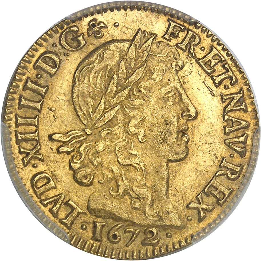 Louis XIV (1643-1715). Louis d’or juvénile lauré 1672, L, Bayonne. PCGS Genuine Cleaned-UNC Detail (48484461).