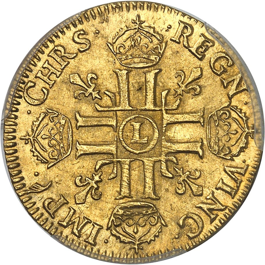 Rv. (à 9 h) .CHRS. - .REGN. - .VINC. - .IMP (différent). Croix formée de huit L adossées, chaque bras étant couronné, avec (atelier) en cœur, cantonnée de quatre lis divergeant du centre.