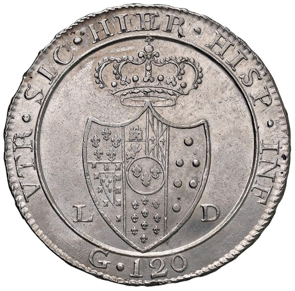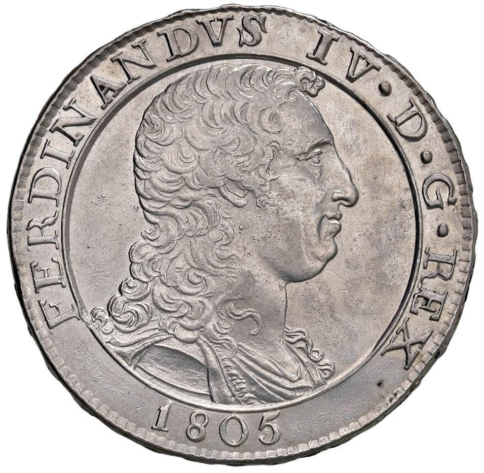 NAPOLI Ferdinando IV (1799-1805) Piastra da 120 grana 1805 variante con HEER al R/ - Magliocca (edizione 2025) manca; Nomisma manca; Gig. 71a AG (g 27,12) RRR Ottimo esemplare di questa variante estremamente rara, non presente sul Nomisma e di cui il Gigante non indica nessuna quotazione.