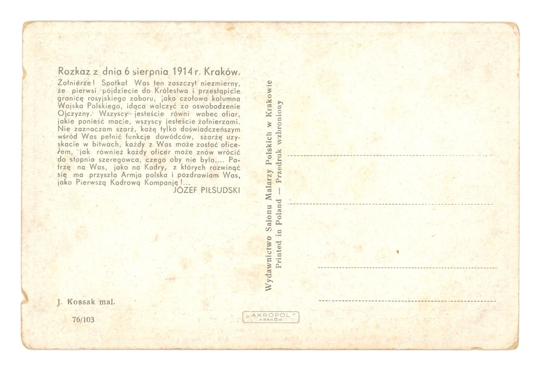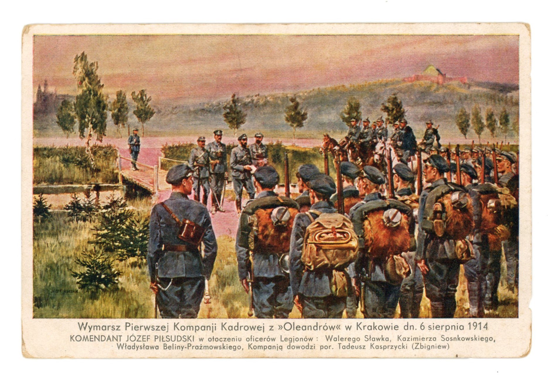 Pocztówka patriotyczna - Wymarsz Pierwszej Kompanii Kadrowej z Oleandrów w Krakowie 6.08.1914(