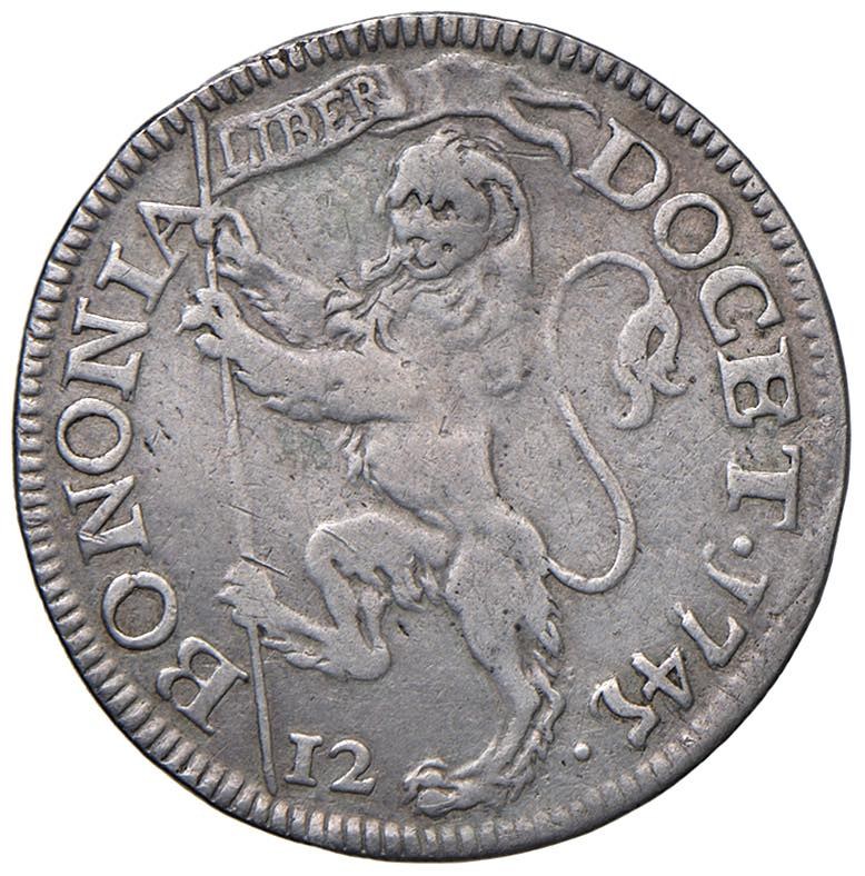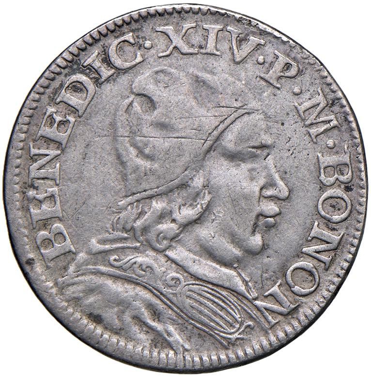 Benedetto XIV (1740-1758) Bologna - Bianco 1745 - Munt. 230a AG (g 3,08) RRRR Non abbiamo reperito nessun passaggio in asta pubblica di questo millesimo. Sono presenti due esemplari al Civico di Bologna e uno alla Collezione Reale.