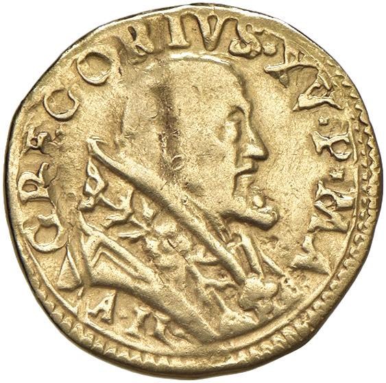 Gregorio XV (1621-1623) Scudo d'oro An. II - Munt. 7 AU (g 3,17) RRR Esemplare senza segno di zecca, moneta veramente di rarissima apparizione. Proveniente da montatura.