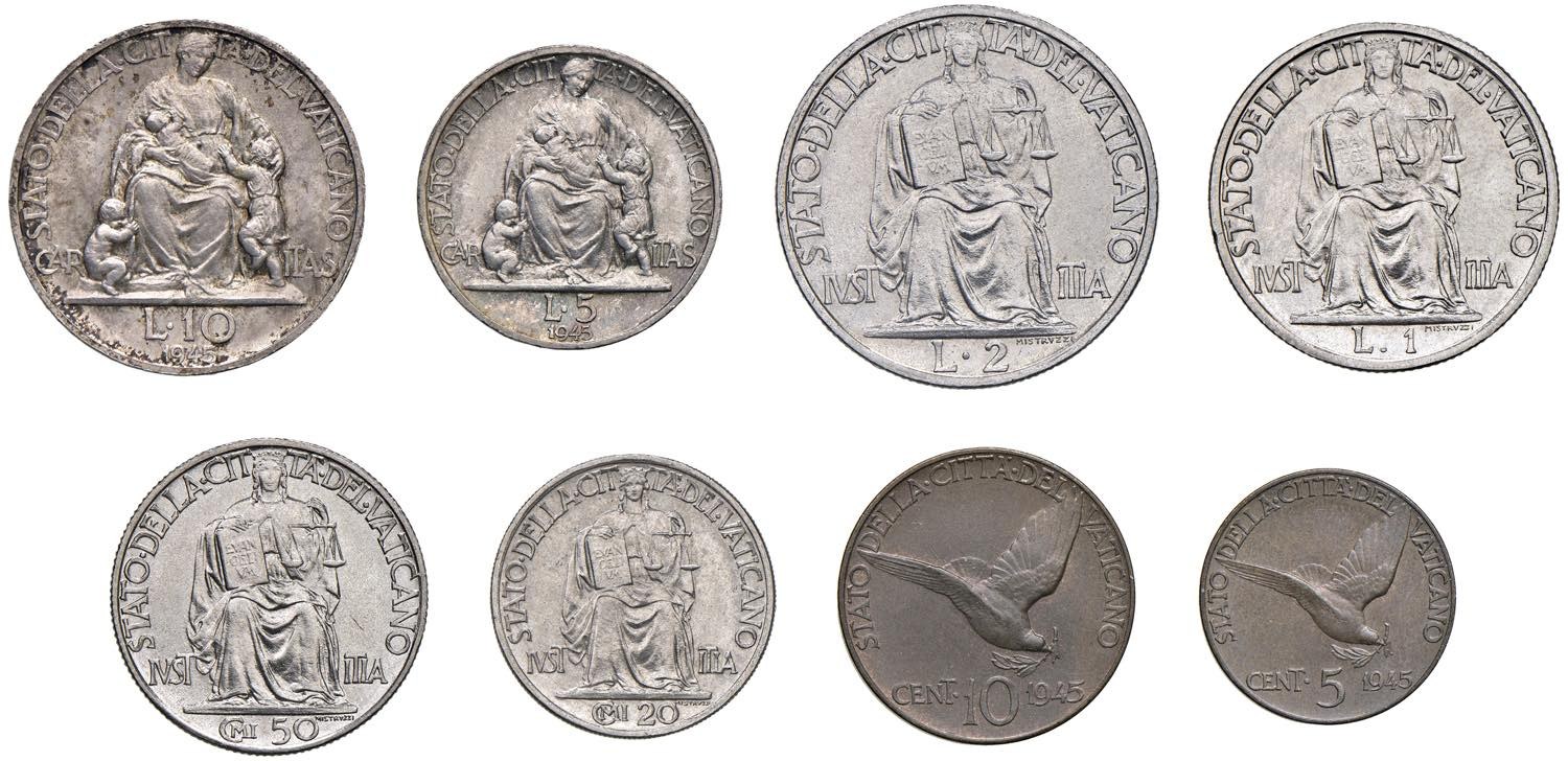 Pio XII (1939-1958) Serie divisionale di 8 monete 1945 An. VII - Nomisma 961a AG, NI, CU RRR