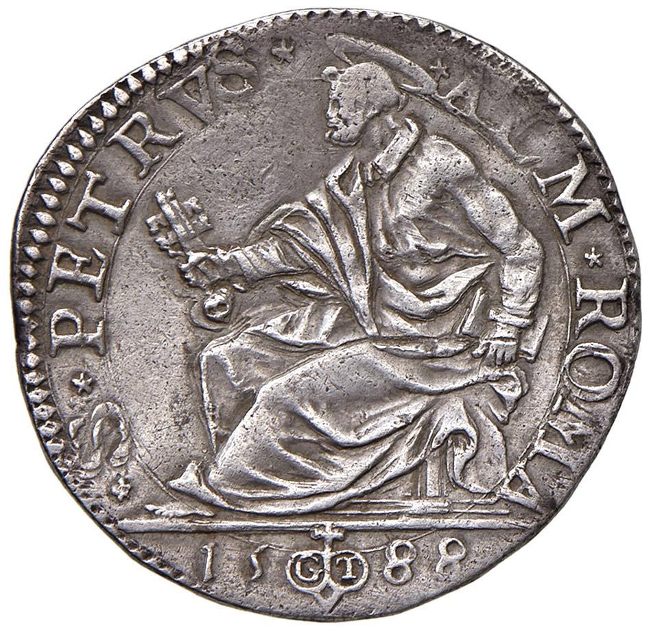 Sisto V (1585-1590) Testone 1588 - Munt. 47 AG (g 8,88) RRR Lievi graffi sul contorno, forse per probabile provenienza da montatura. Esemplare comunque di buona qualià per questo rarissimo millesimo.