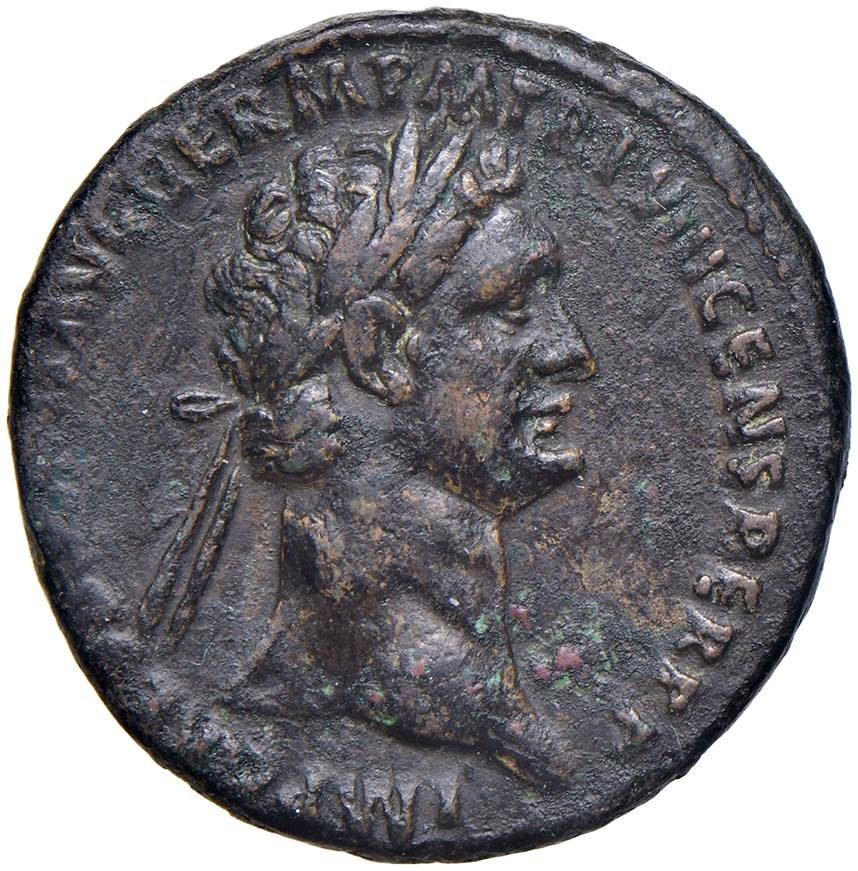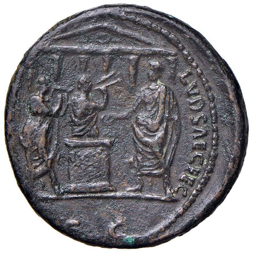 Domiziano (81-96) Asse - Testa laureata a d. - R/ COS XIIII LVD SAEC FEC, scena di sacrificio - RIC 385a AG (g 10,80) Ex Nomisma 32, maggio 2006, lotto 201. Colorazione marrone, campi leggermente puliti al D/ ma buon R/ nitido