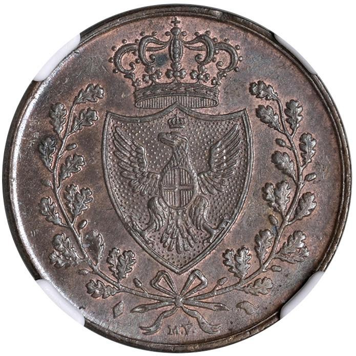 Carlo Felice (1821-1831) 5 Centesimi 1826 T - Nomisma 615 CU TOP POP, in slab NGC MS 65 BN n° 6287044-012.