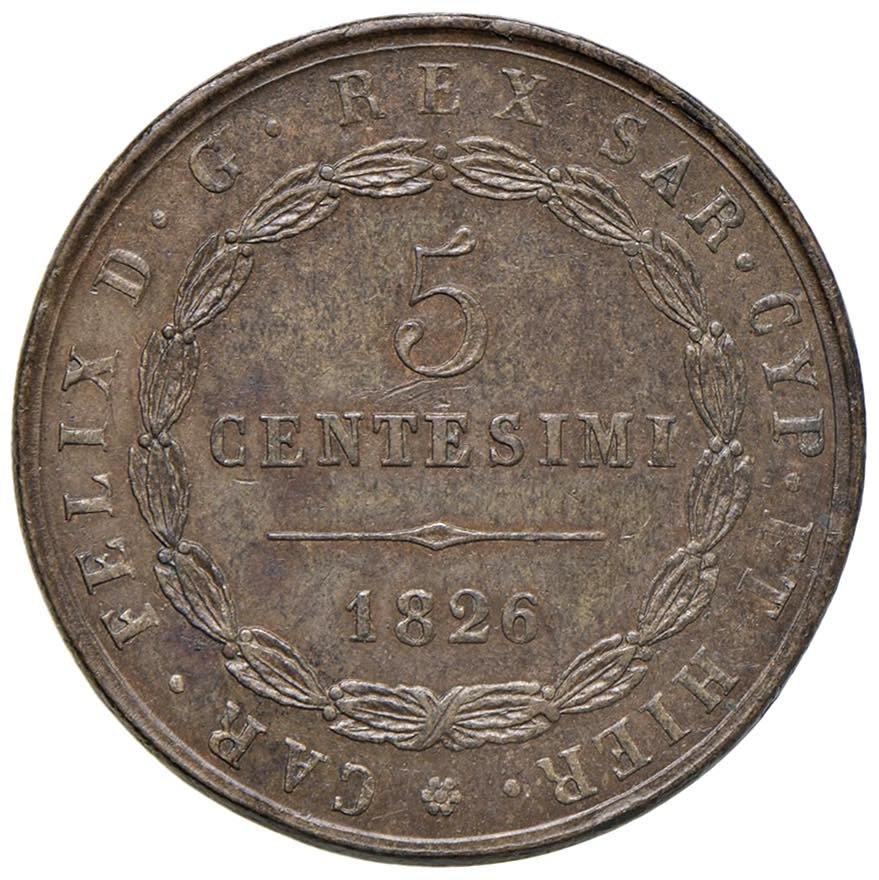 Carlo Felice (1821-1831) 5 Centesimi 1826 T - Nomisma 616 CU RR Sigla zecchiere Luca Podestà.