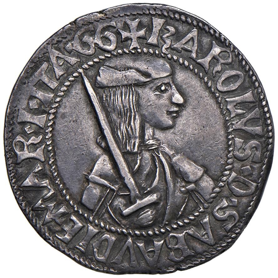 * Carlo I (1482-1490) Testone (Cornavin, sigla GG) - MIR 227 AG (g 9,60) RR Esemplare di buona qualità con una bella e delicata patina.