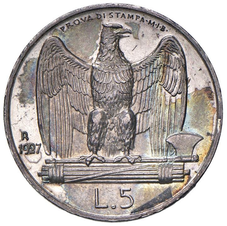 Vittorio Emanuele III (1900-1946) 5 Lire 1927 Prova di Stampa M.I.B. - Luppino PP 178; P.P. 231 AG RRRR Minimi graffietti da pulitura al D/