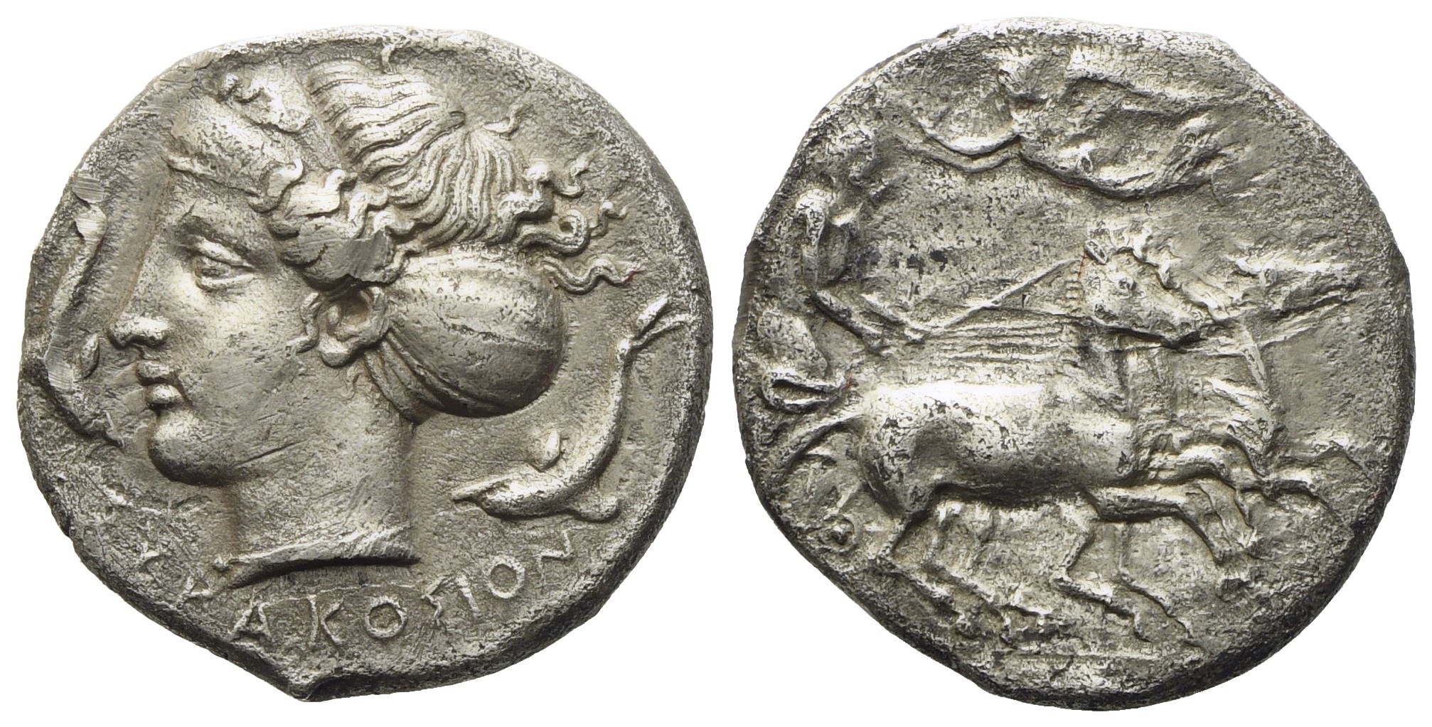 Charioteer driving fast quadriga r.; above, Nike flying left, crowning charioteer; in exergue, two dolphins confronted; Rv. Head of Arethusa r., hair in sphendone; two dolphins around. SNG ANS 305; SNG Lloyd 1376–7. Some roughness and porosity. Fine style. Good very fine.