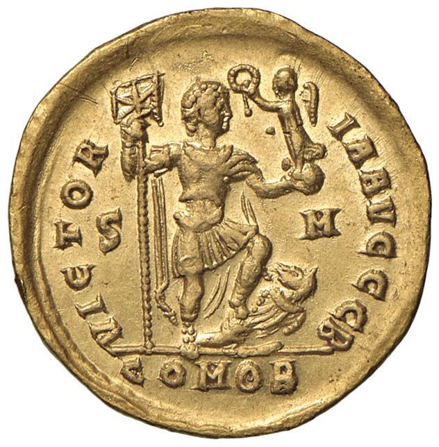 Onorio (393-423) Solido (Sirmium) Busto diademato a d. - R/ L'imperatore stante a d. - RIC 14e AU (g 4,41) R