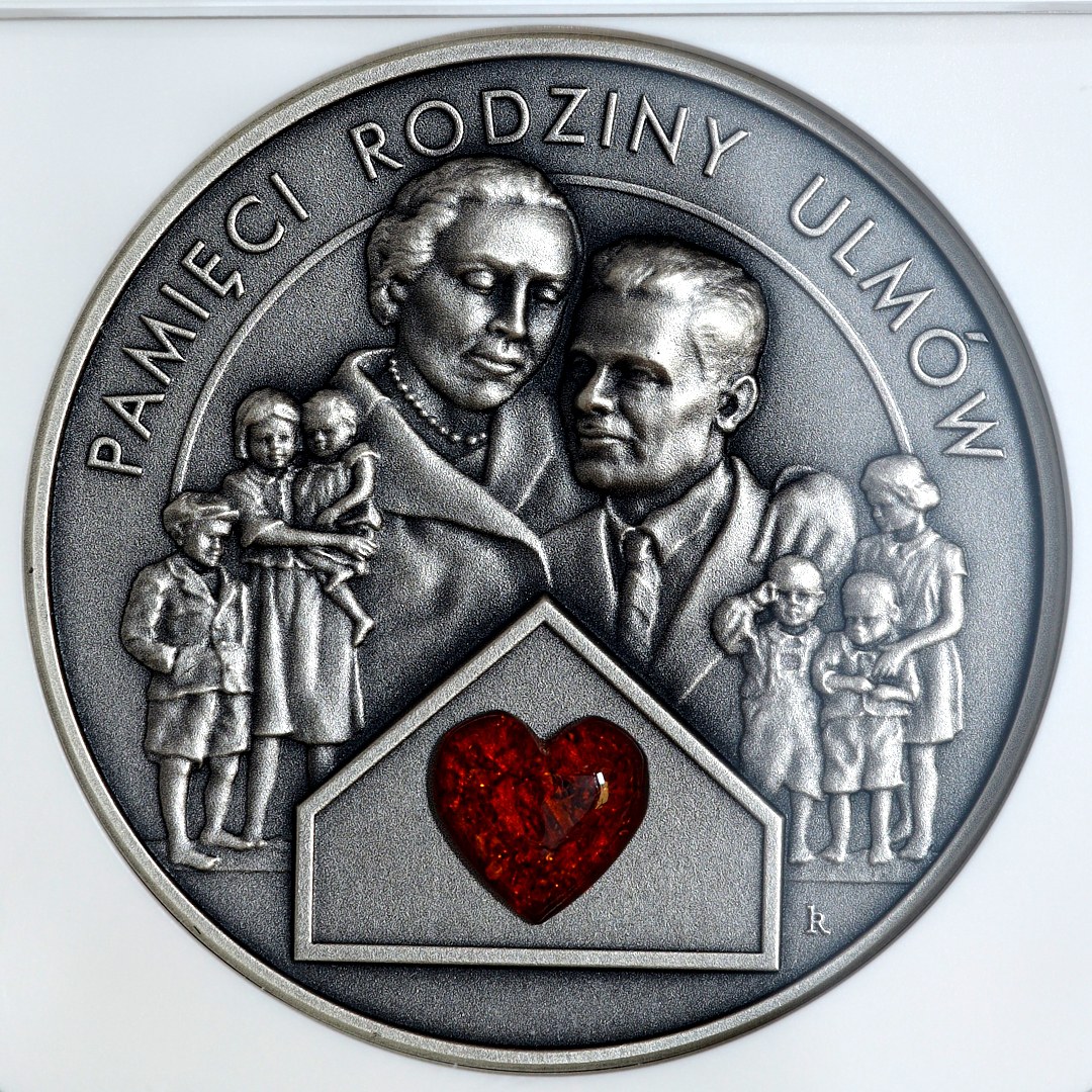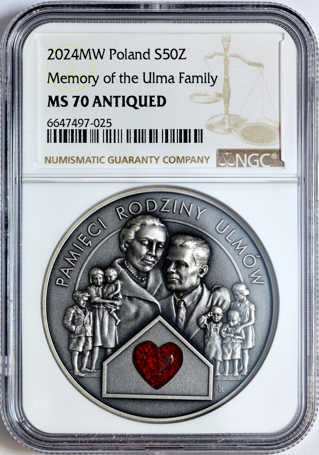Moneta oksydowana z bursztynem w kształcie serca.