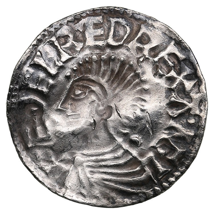 Obv.: Draped bust left; “+ÆDELRÆD REX ANGL”.