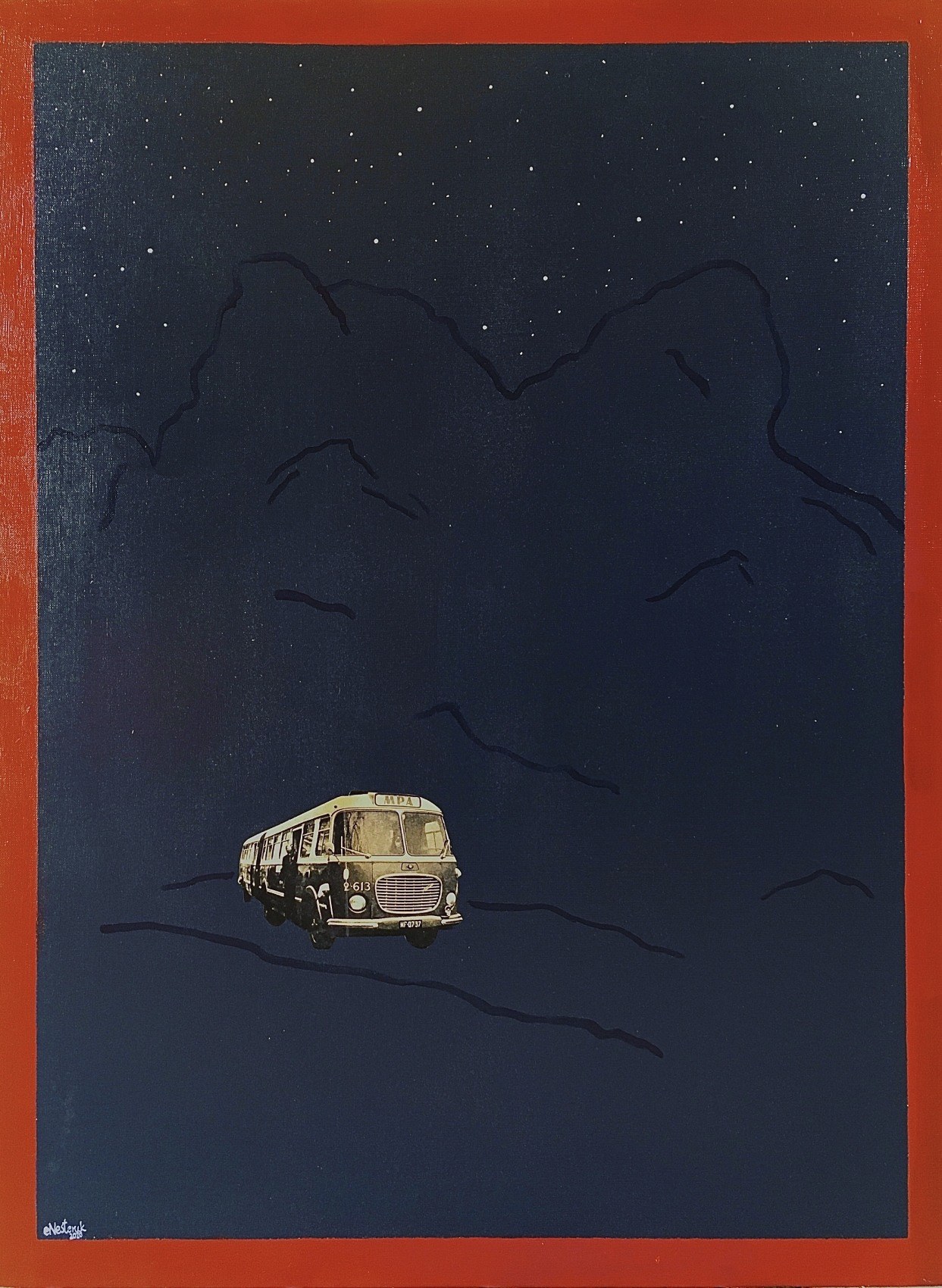 technika mieszana, akryl, kolaż, werniks błyszczący/płótno,