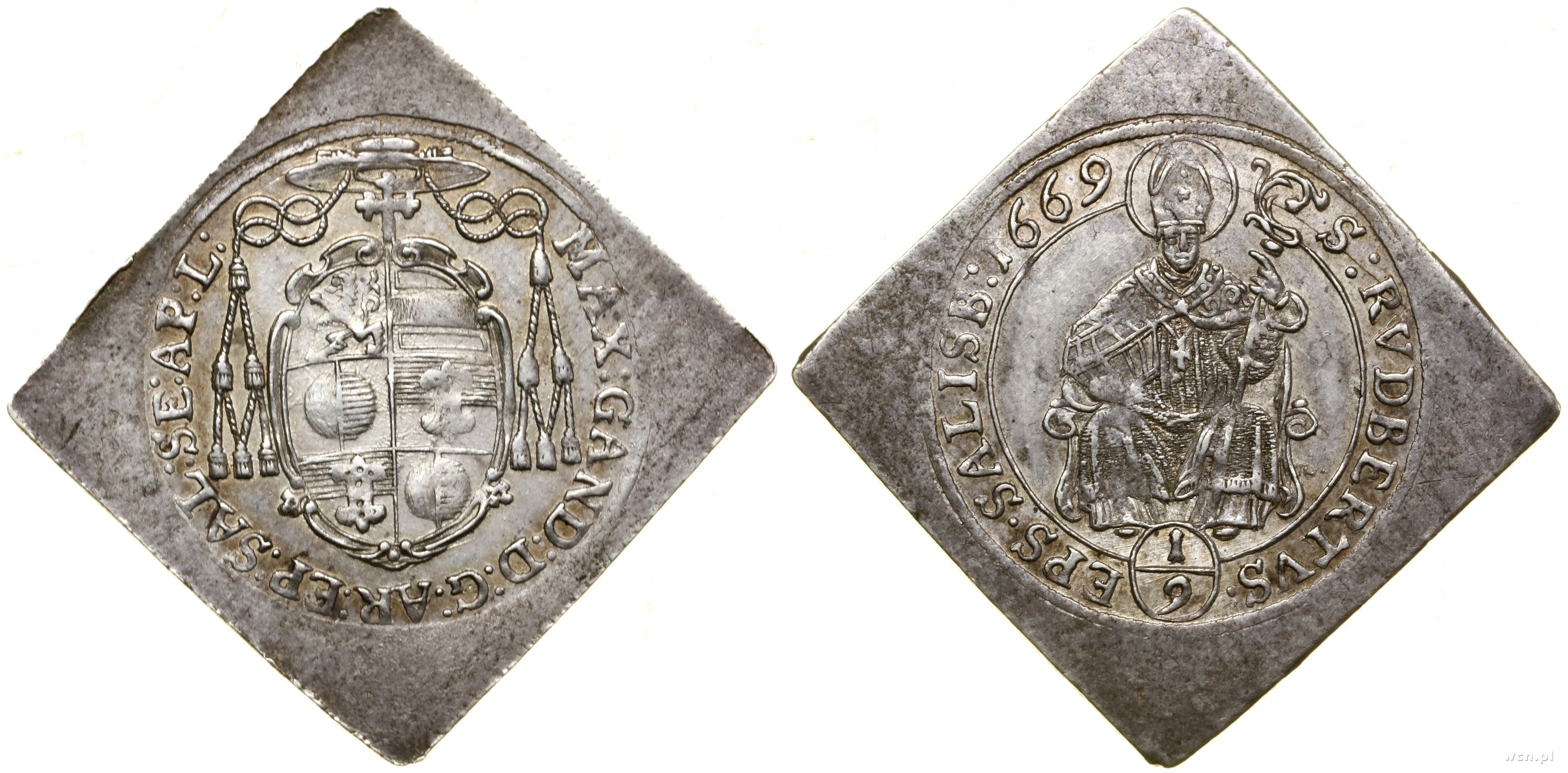 Aw: Wielopolowa tarcza herbowa, powyżej kapelusz biskupi z chwostami, legenda, Rw: Św. Rupert siedzący na tronie, na wprost, legenda