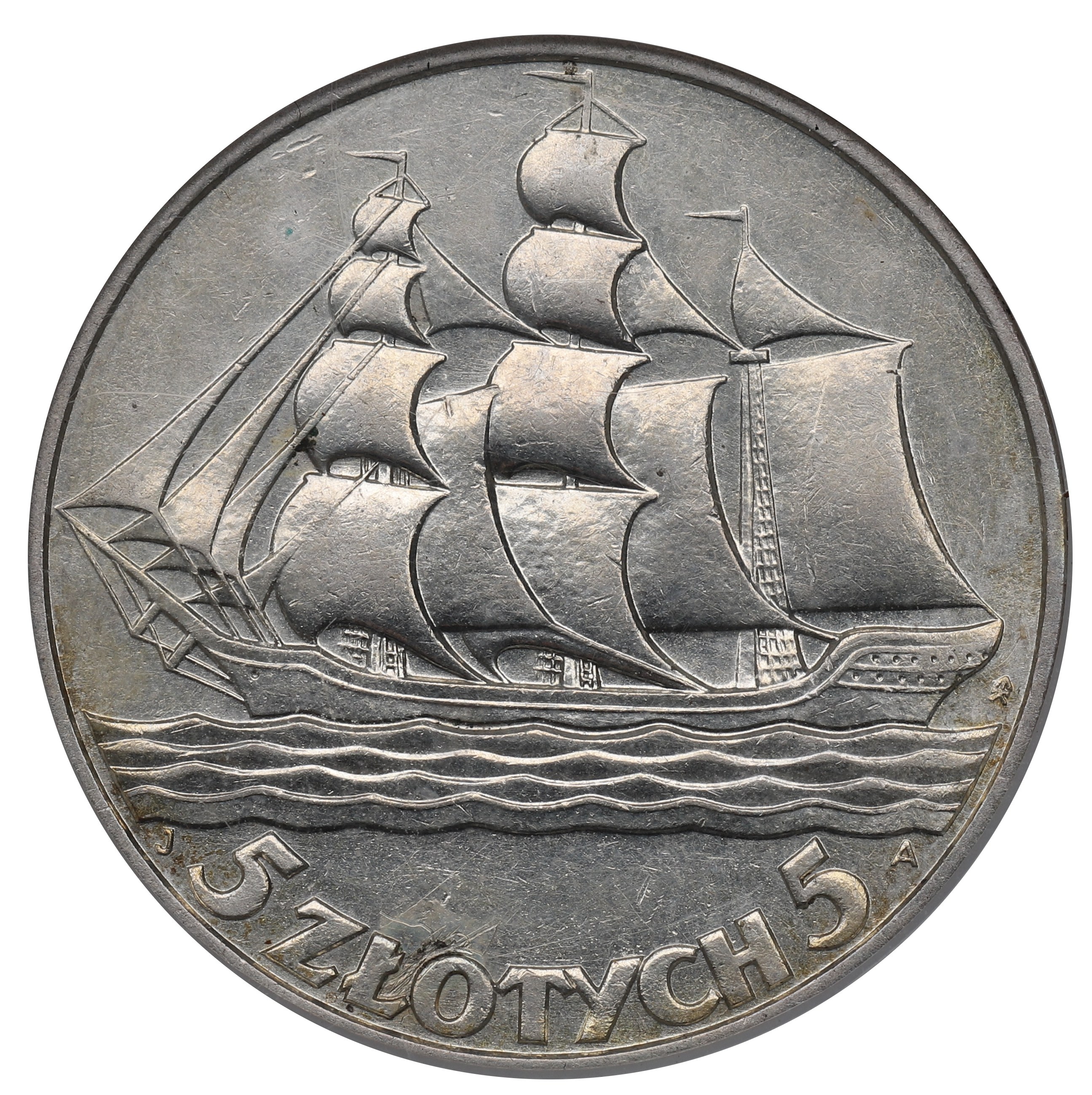 Rewers: widok okrętu na morzu, niżej napis 5 ZŁOTYCH 5, inicjały projektanta J-A. Nad falami, po prawej herb Kościesza – znak Mennicy Państwowej w Warszawie.